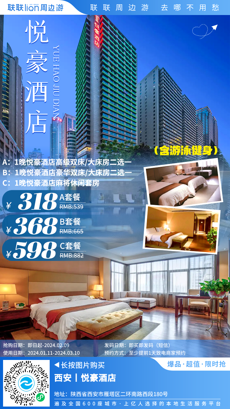 【悦豪酒店】318元享高级大床/双床房套餐;368元享豪华大床/双床房套餐;598元享悦豪休闲套房套餐!