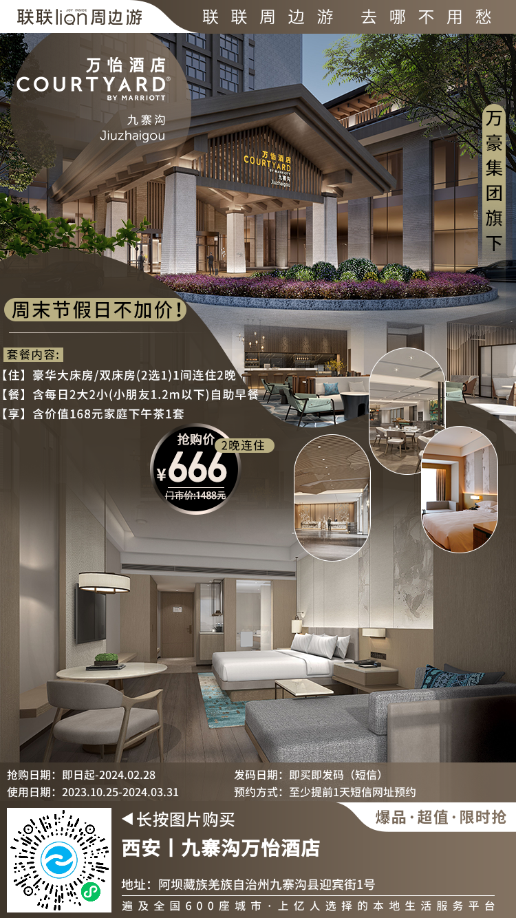 【九寨沟万怡酒店·双11大促丨低至333元/晚·赠下午茶】亲临人间仙境,住九寨万豪旗下首家万怡酒店!仅666元享【九寨沟万怡酒店】豪华大床房/双床房(2选1)1间连住2晚!含每日2大2小(1.2m以下)自助早餐!更有家庭下午茶可享!