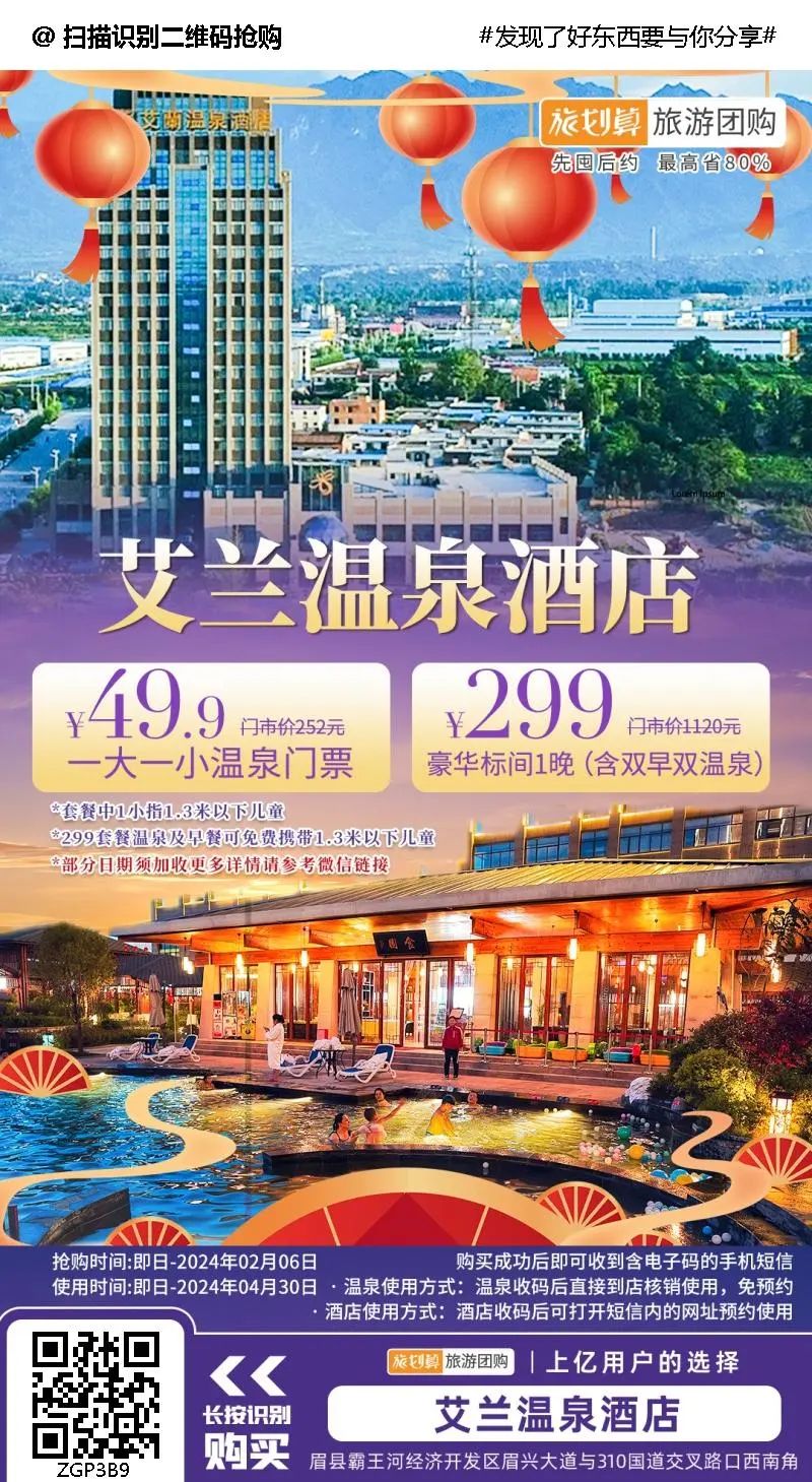 【新年特惠·全网DU家·太白山】再泡太白舒适泉!¥49.9抢价值252元「艾蘭温泉酒店」1大1小温泉套票!299元抢豪华标间等!