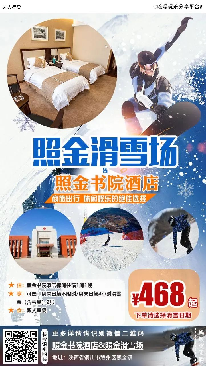 推荐8:(双人周末日场4小时住滑套)照金书院酒店大床/标间住宿+双人自助早餐+周末日场4小时滑雪票2张(含雪具)