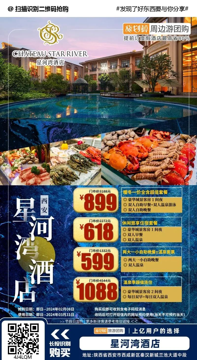 【秦汉新城】享受品质和悠闲的舒适生活!¥599起抢「星河湾」两大一小自助晚餐+温泉套票!¥618抢豪华城景客房套餐!