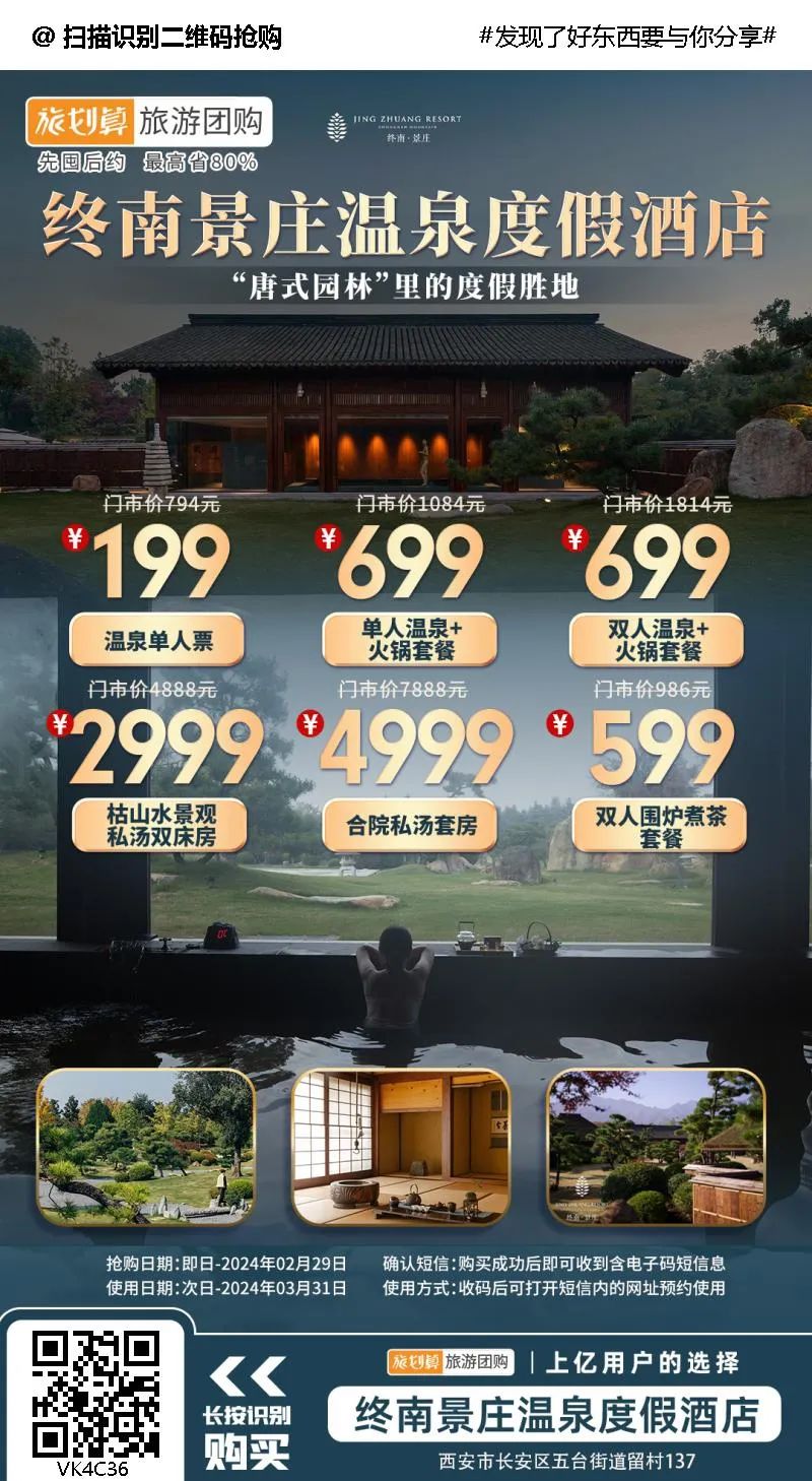 【长安区丨五台街道】“唐式园林”里的度假胜地!¥199起抢价值794元「终南景庄温泉度假酒店」温泉单人票!¥599抢双人围炉煮茶
