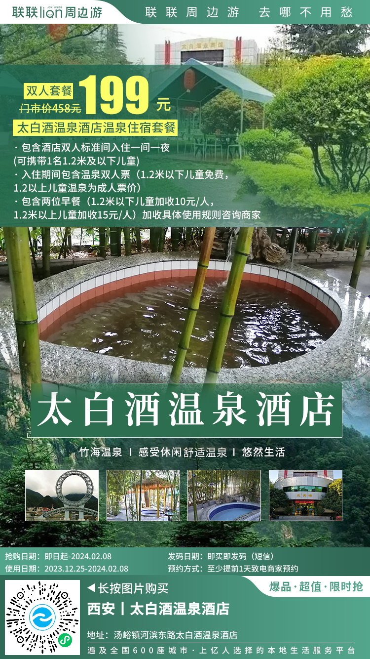 199元享太白酒温泉酒店温泉住宿套餐:包含酒店双人标准间入住一间一夜(可携带1名1.2米及以下儿童) · 入住期间包含温泉双人票(1.2米以下儿童免费,1.2以上儿童温泉为成人票价) · 包含两位早餐...