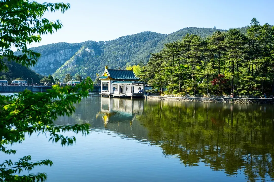 进入景区,一幅山水画呈现在眼前,九曲桥和明镜湖交相辉映,星月映照散花阁,后面群山环绕,神秘又安详。