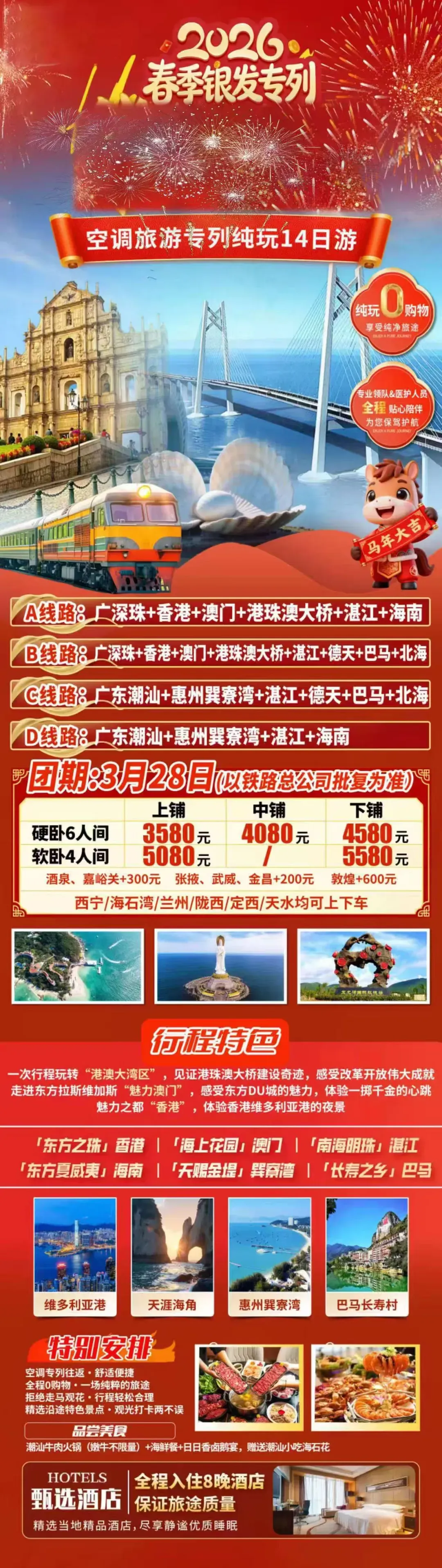 B线:2026 年品质升级系列之广深珠、香港、澳门、港珠澳大桥、湛江、德天、巴马、北海空调旅游专列纯玩14日游
