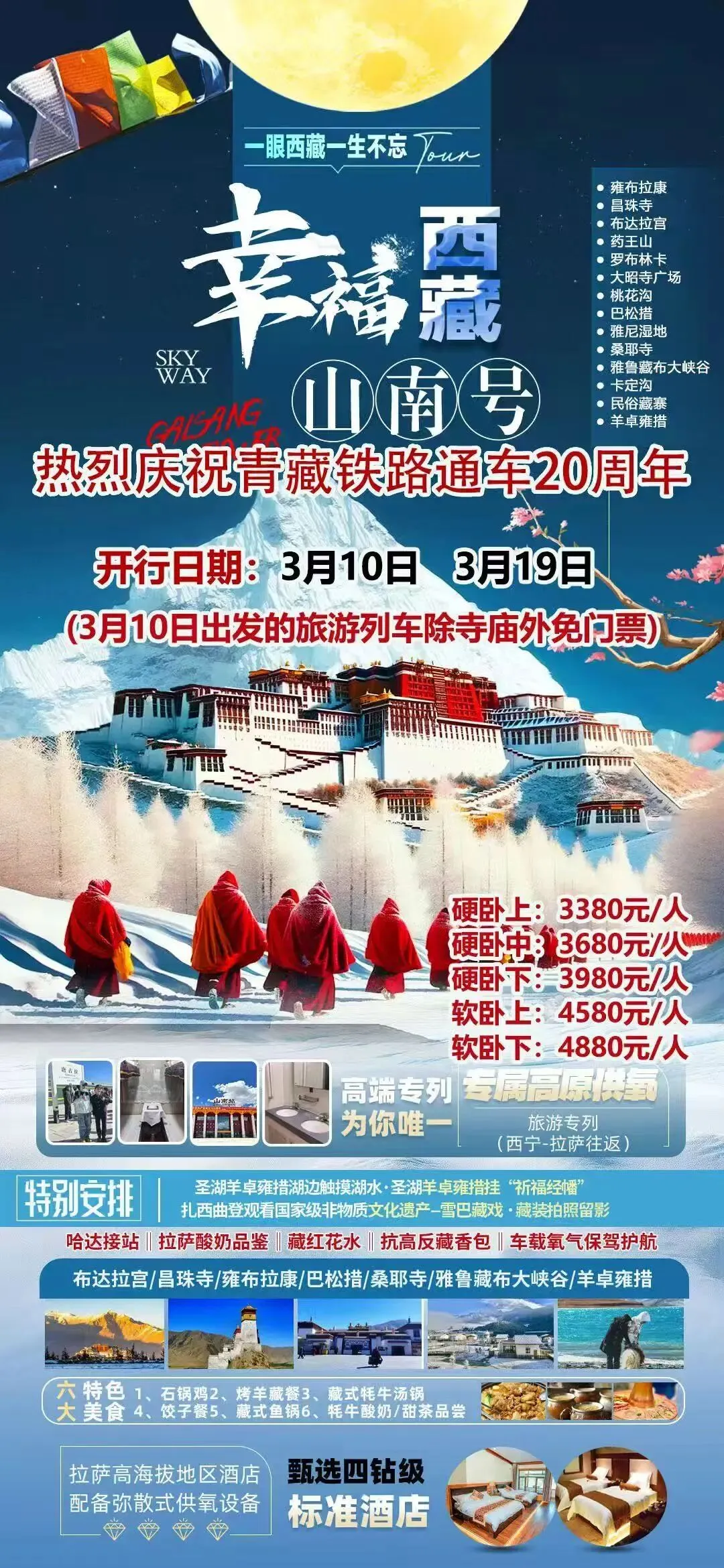 雍布拉康+昌珠寺+桑耶寺+布达拉宫+药王山+罗布林卡+大昭寺广场+桃花沟+巴松措+雅尼湿地+雅鲁藏布大峡谷+民俗藏寨+羊卓雍措。2026年一眼西藏·一生不忘开启幸福西藏之旅”专列9日游