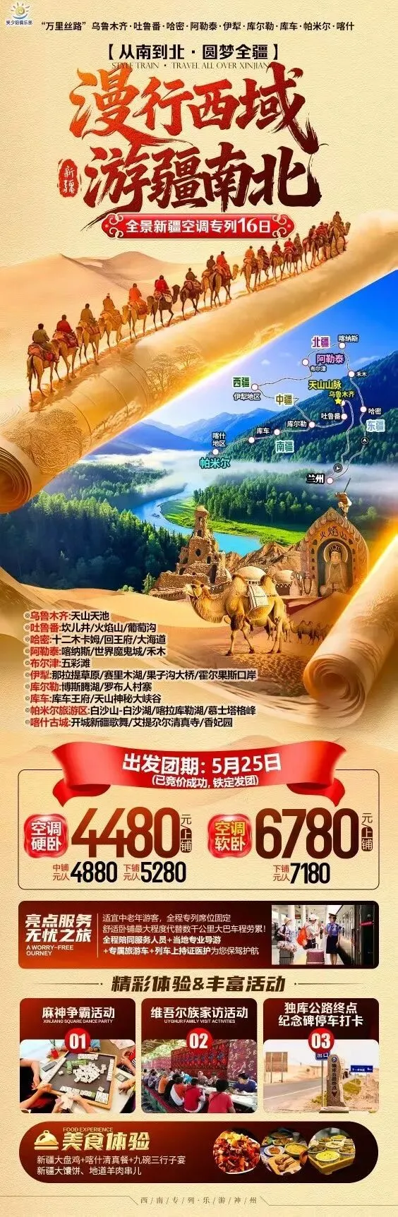 乌鲁木齐-昌吉-天山天池-阿勒泰-喀纳斯-禾木-五彩滩-S21 沙漠公路-乌尔禾魔鬼城-伊犁-那拉提草原-赛里木湖-霍尔果斯口岸-吐鲁番-坎儿井-火焰山-葡萄庄园-天山神秘大峡谷-独库公路界碑-阿尔泰-喀什-香妃园-艾提尕尔大清真寺-喀什老城-帕米尔高原-克州卡拉库里湖-白沙湖-库尔勒罗布人村寨-大海道魔鬼城-哈密回王府-十二木卡姆文化中心-兰州