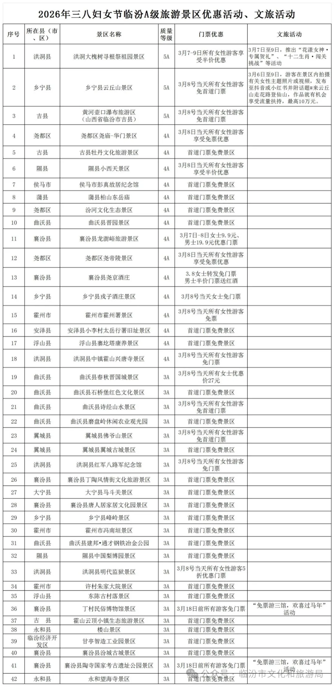 临汾A级景区优惠活动