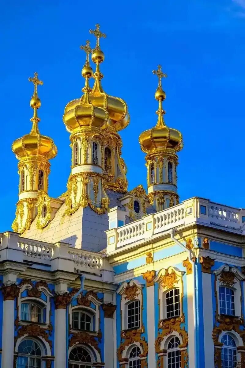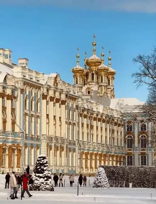 叶卡捷琳娜宫又称凯瑟琳宫,位于圣彼得堡以南约25公里处,是1717年特别为彼得一世的妻子、也是其女儿伊丽莎白女皇、叶卡捷琳娜二世、亚历山大一世及尼古拉二世喜爱的郊外行宫。为了彰显身份,宫殿所处的一带(包括亚历山大宫以及白塔观景台等)在其建成后即被称为沙皇村或皇村。1937年为纪念普希金在此度过童年又改为现名“普希金村”。“金发碧眼”的外观叶卡捷琳娜宫是一座两层楼高的宫殿,正面长达300多米,主要由蓝、白、黄三色构成,据说这分别代表着女主人蓝色的眼睛、白色的皮肤和金黄的头发。建筑师加建了皇宫教堂及作为行政管理之用的厢房,顶部加盖上五座金碧辉煌、颇具特色的洋葱形圆屋顶。