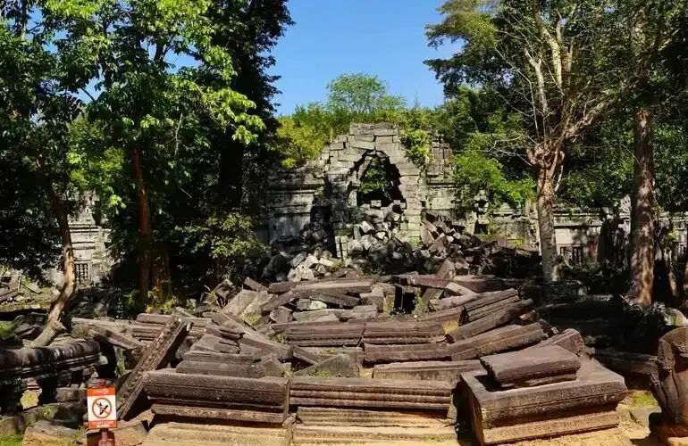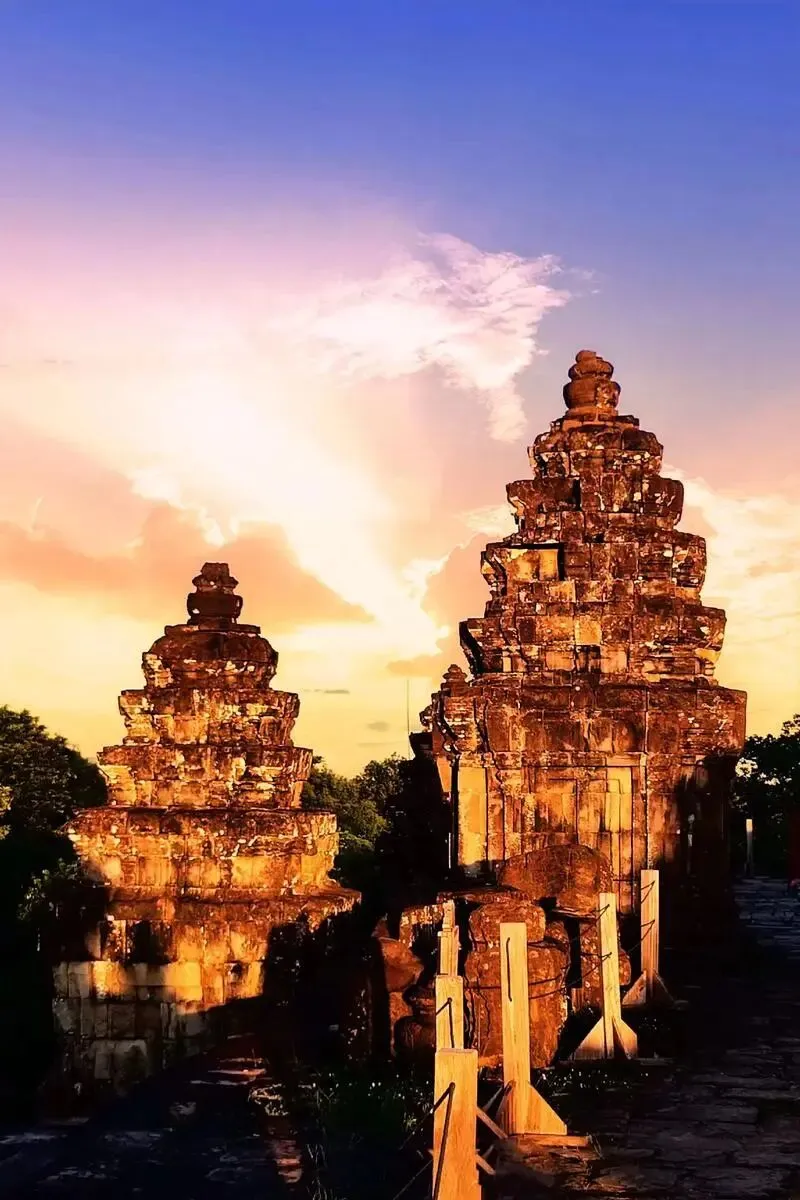 崩密列(Beng Mealea)是位于柬埔寨吴哥古迹群以东40公里处的印度教寺庙,建于11世纪末至12世纪初苏利耶跋摩二世时期,用于供奉湿婆神。该寺庙采用砂岩建造,因材料特性导致建筑严重损毁且难以复原,现呈现未完工的原始风貌,寺内雕刻包含佛教主题元素。护城河呈十字对称结构。寺庙长期被丛林覆盖且位置偏远,未纳入常规吴哥景区范围。多部电影在此取景,其中《虎兄虎弟》拍摄时搭建的栈道成为游览路径。