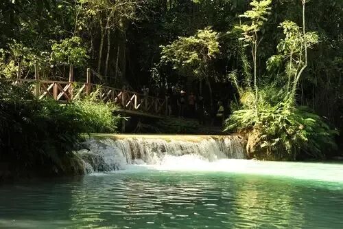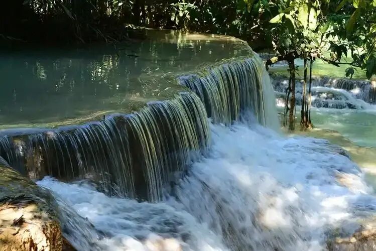 该瀑布由石灰岩地层渗出的含矿物质泉水形成,主瀑高约60米,整体落差约100米,呈正三角形分三级跌落,形成多个蓝绿色钙化池群,水体经阳光折射呈现蒂芙尼蓝色调。雨季水量充沛气势磅礴,旱季则显纤细秀雅。瀑布被山体分为多层阶梯状结构,周边环绕原始热带雨林,设有木栈道连接各层泳池,底部区域允许游泳,中段提供树藤跳水点,也可体验绳索跳水。