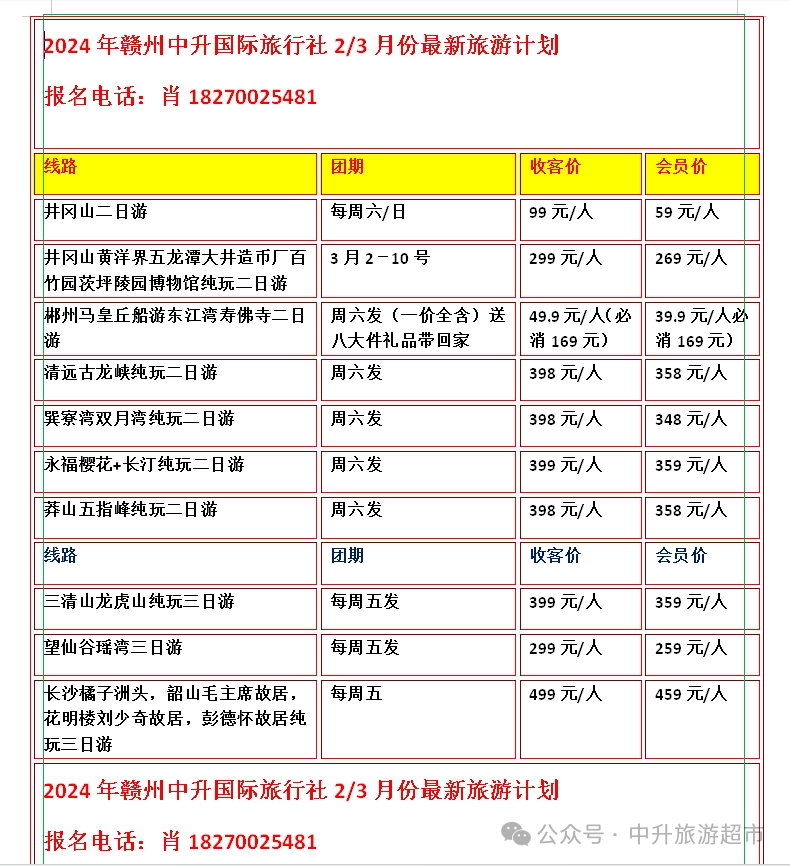 赣州中升国际旅行社2024年3月份最新旅游计划