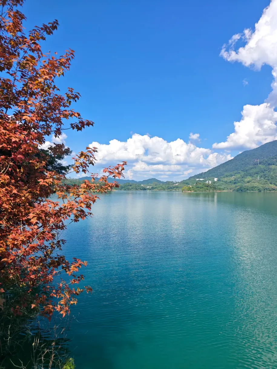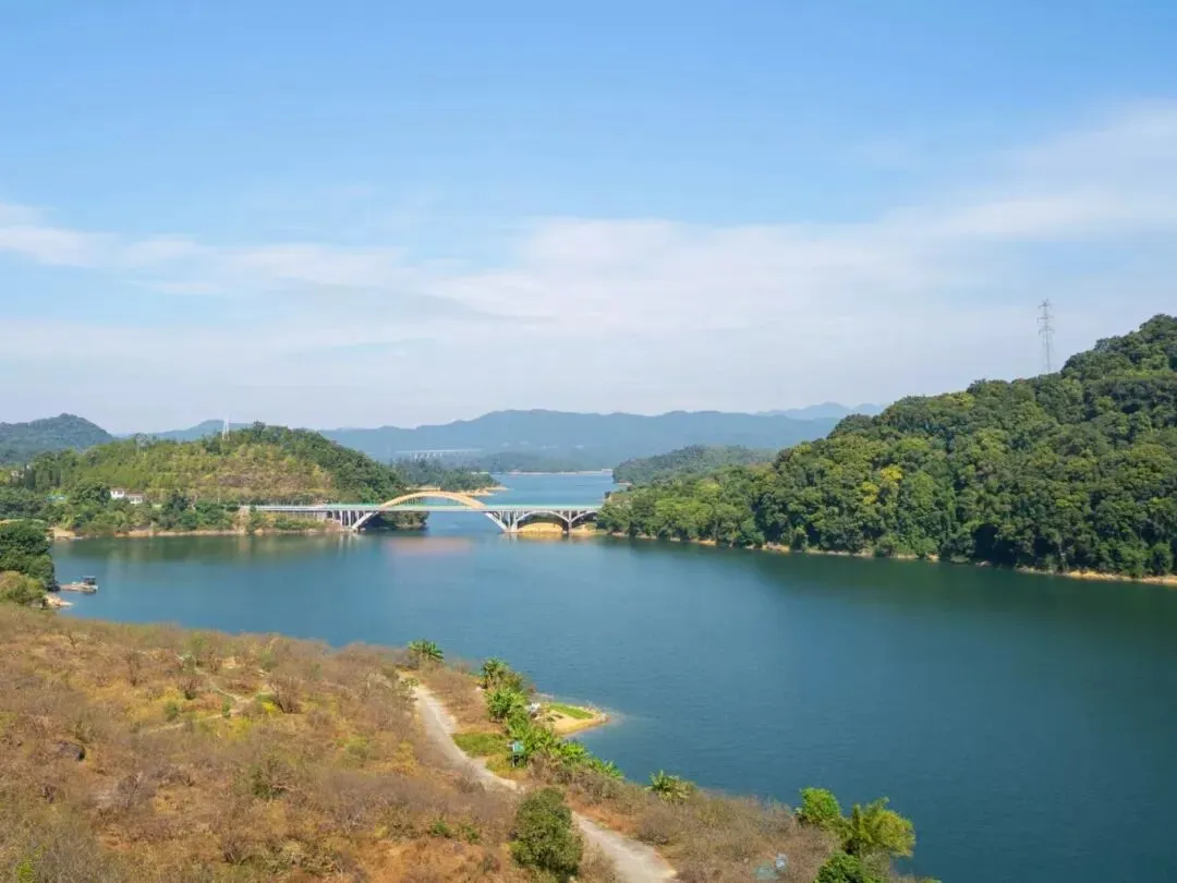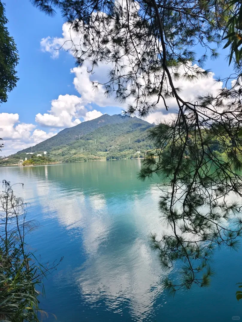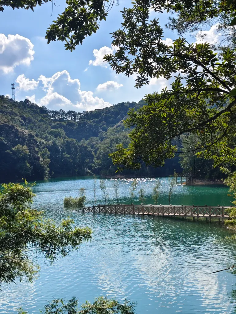 下山后记得直奔隔壁罗浮山脚下的显岗水库,这可是藏在深山里的“翡翠秘境”!沿着环湖碧道慢悠悠骑行散步,看澄澈湖水倒映着罗浮群山,风一吹满是清新草木香,妥妥的天然吸氧地,拍照还自带滤镜,氛围感拉满。
