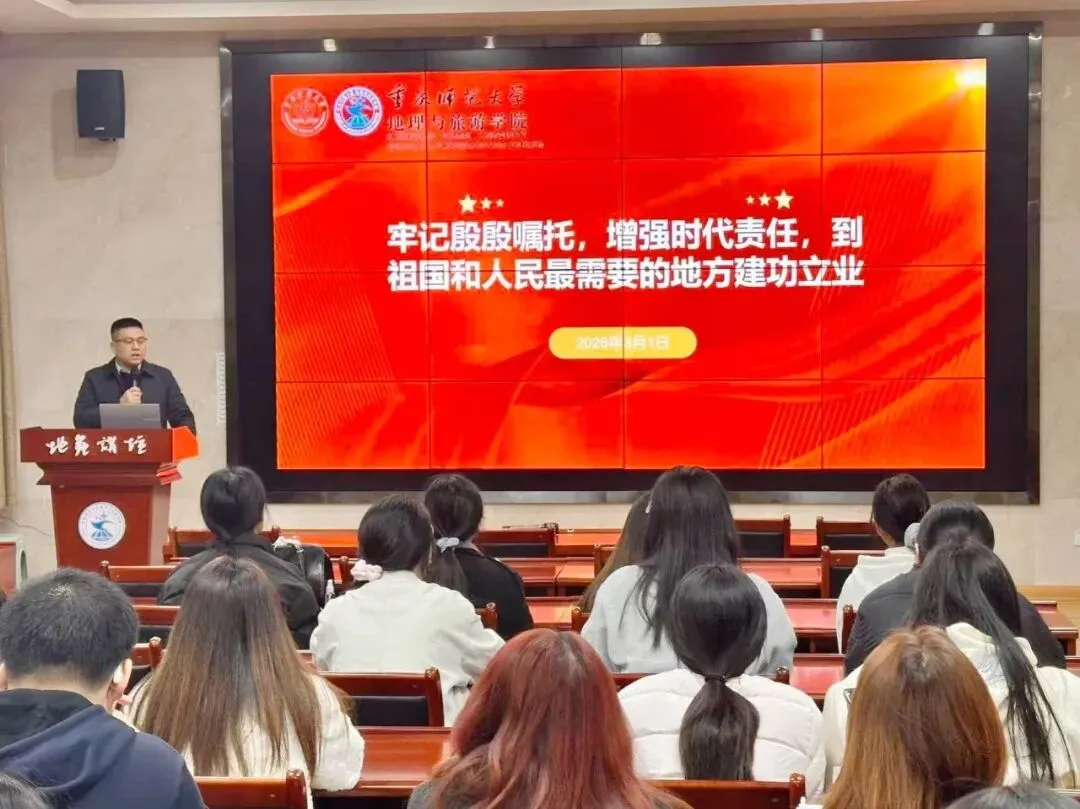 春启新程,初心如磐。为引领地旅学子深入学习贯彻习近平总书记对青年一代的殷切期望,筑牢理想信念根基,厚植家国情怀,强化时代责任担当,2026年3月1日,地理与旅游学院以“牢记殷殷嘱托,增强时代责任,到祖国和人民最需要的地方建功立业”为核心主题,精心谋划、有序开展新学期“开学第一课”主题教育活动。在学院全体辅导员的带领下,全院学子共同参与、共悟初心,在思想碰撞中感悟初心使命,在精神洗礼中凝聚奋进力量。