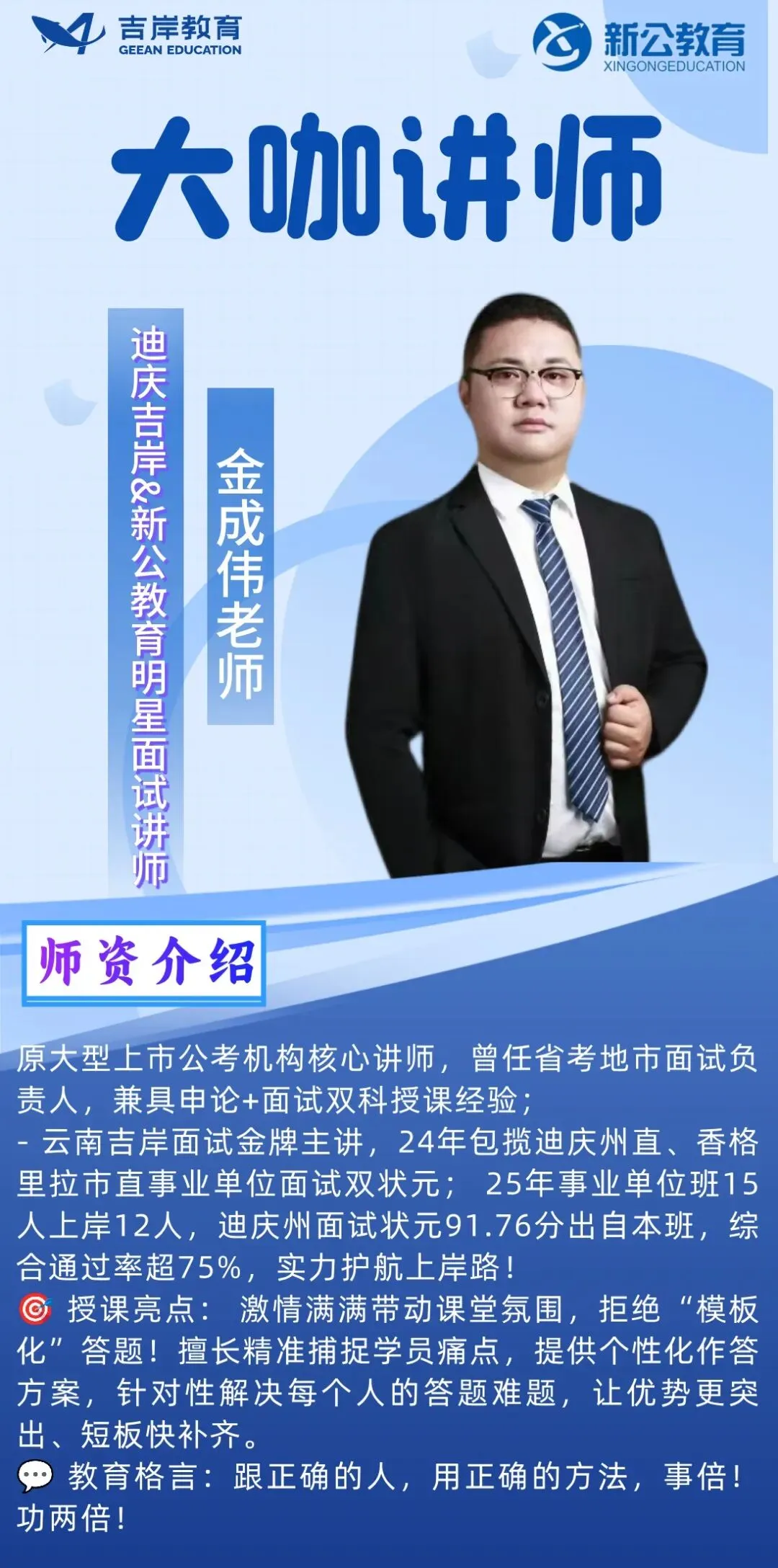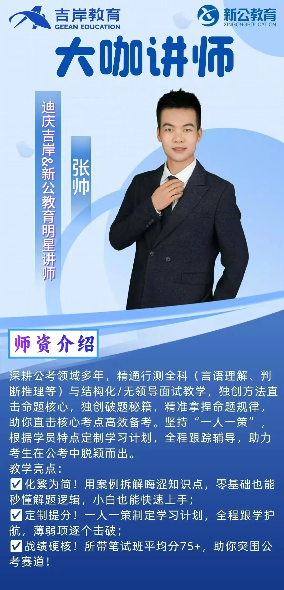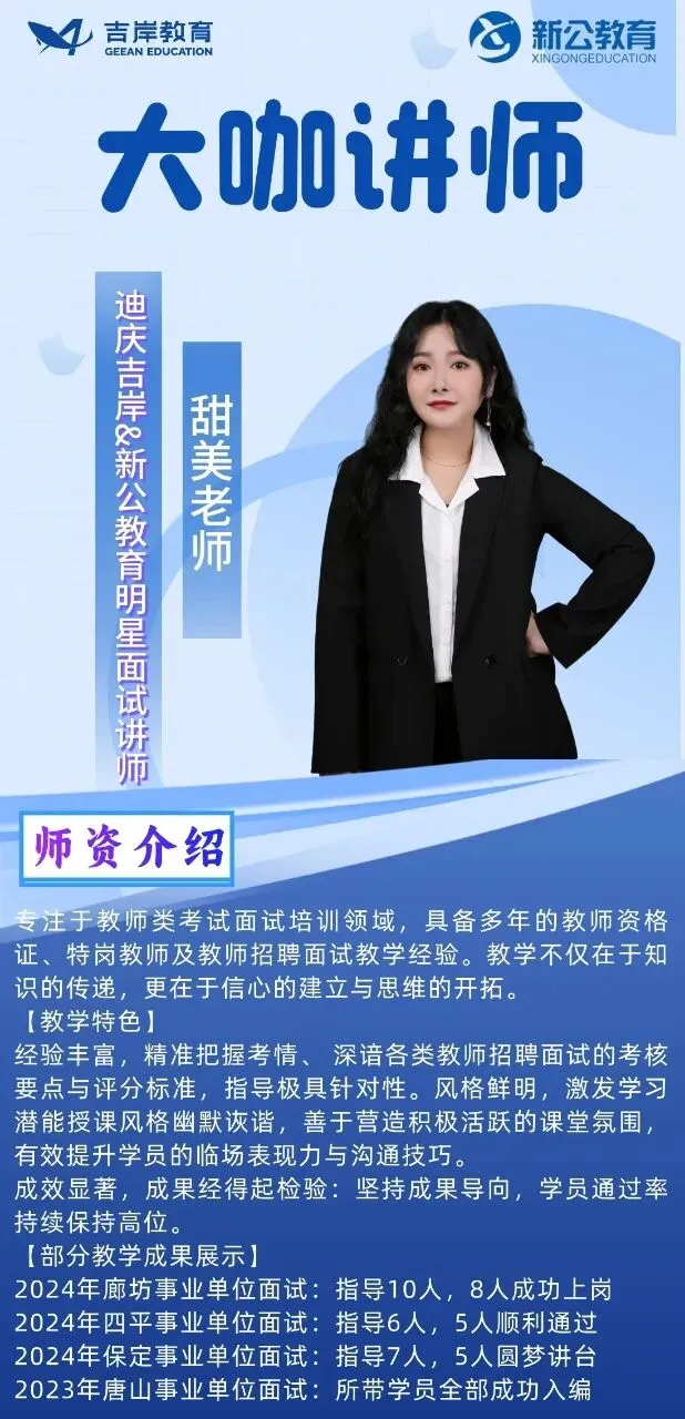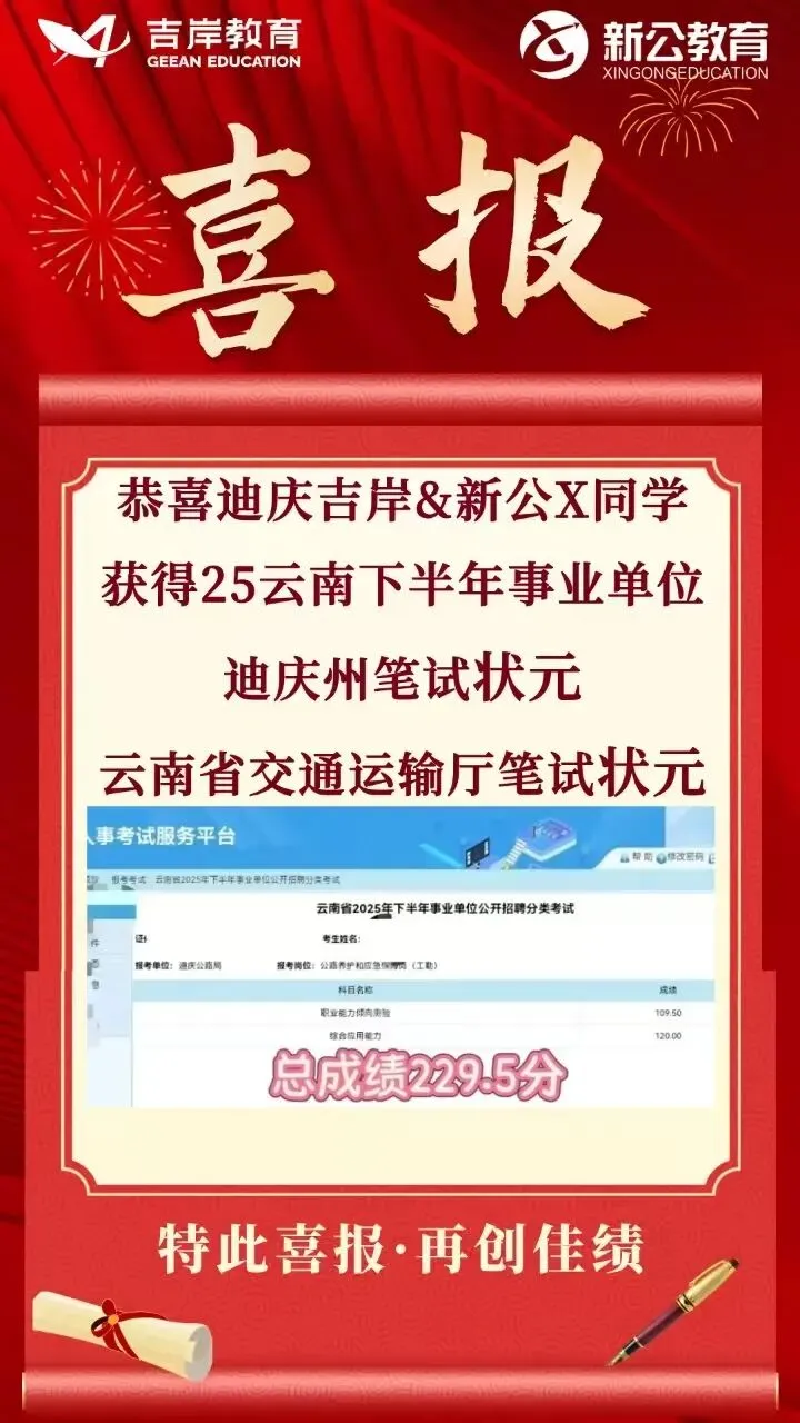 迪庆吉岸&新公教育,经营团队与授课教师均为云南本土公考行业资深从业者,平均教龄8年以上,教研功底扎实、授课经验丰富,精准把握云南各类公职考试命题规律。