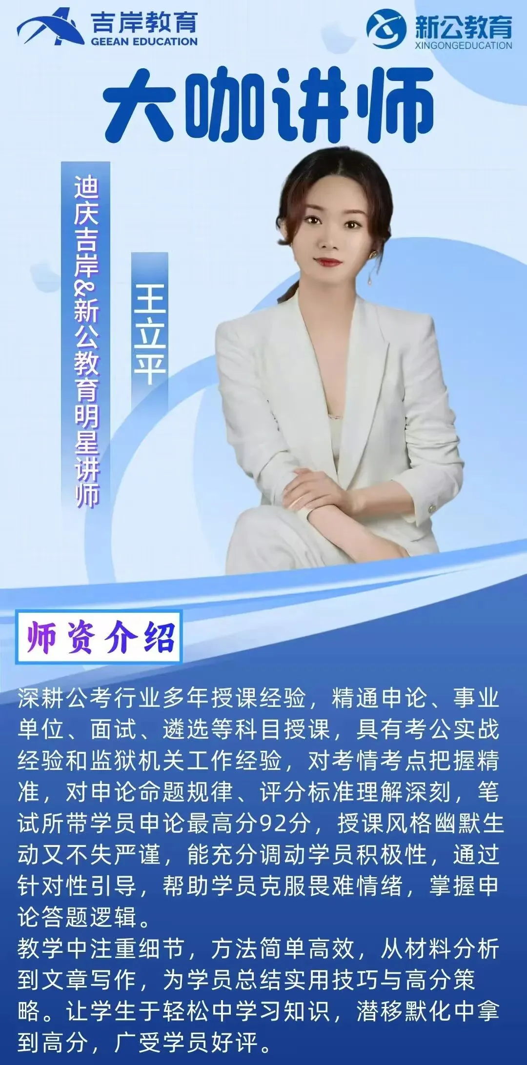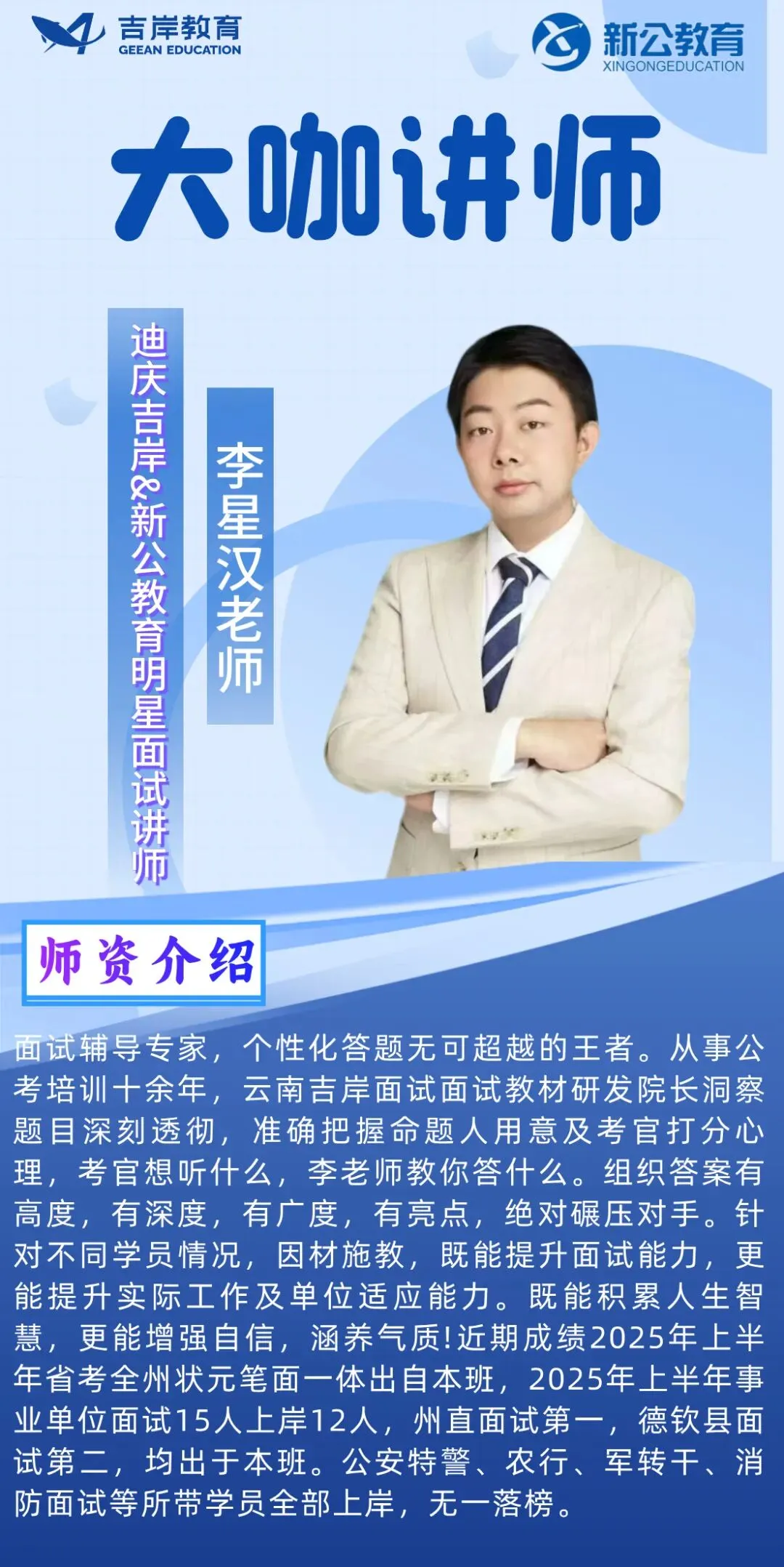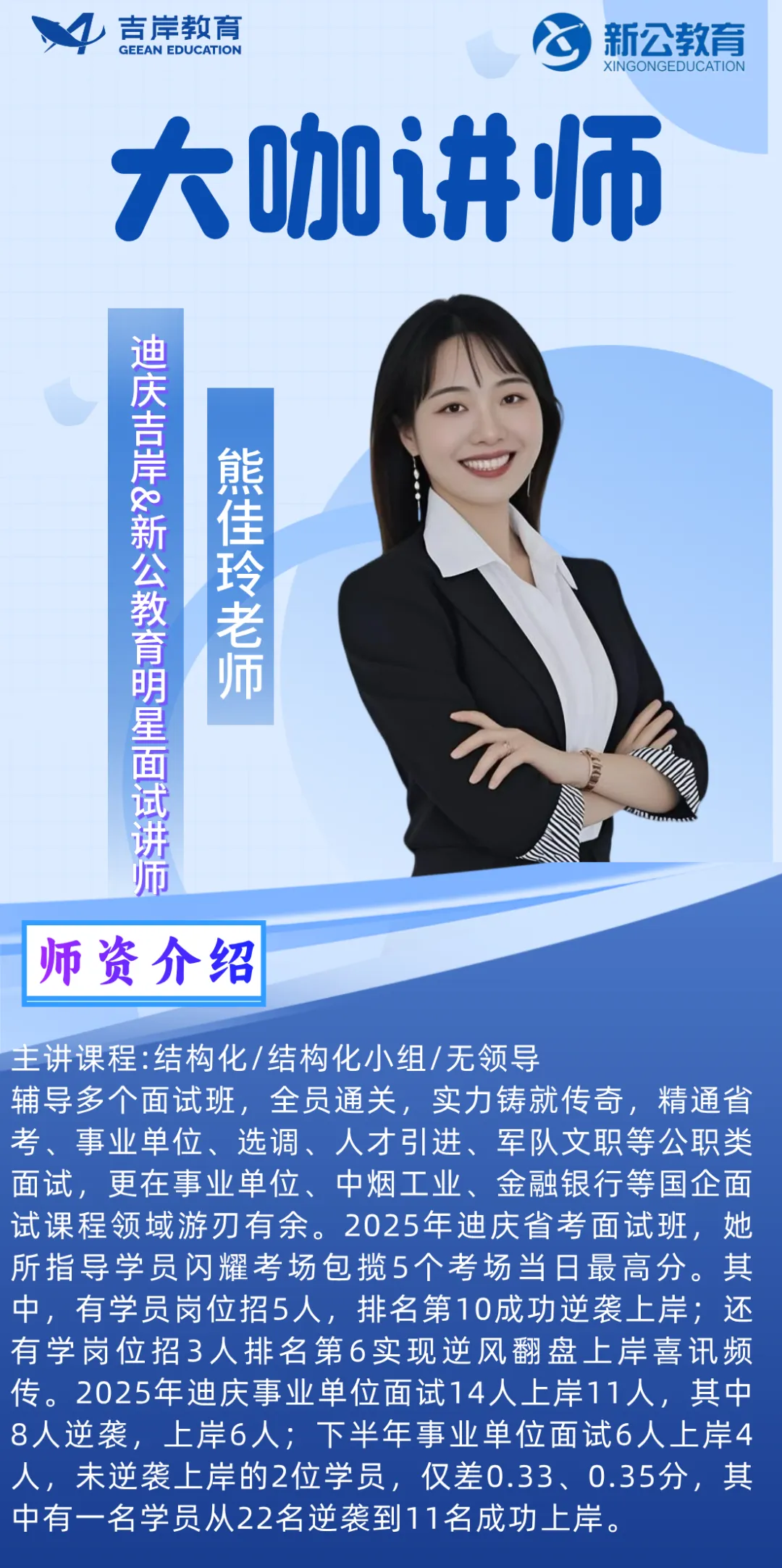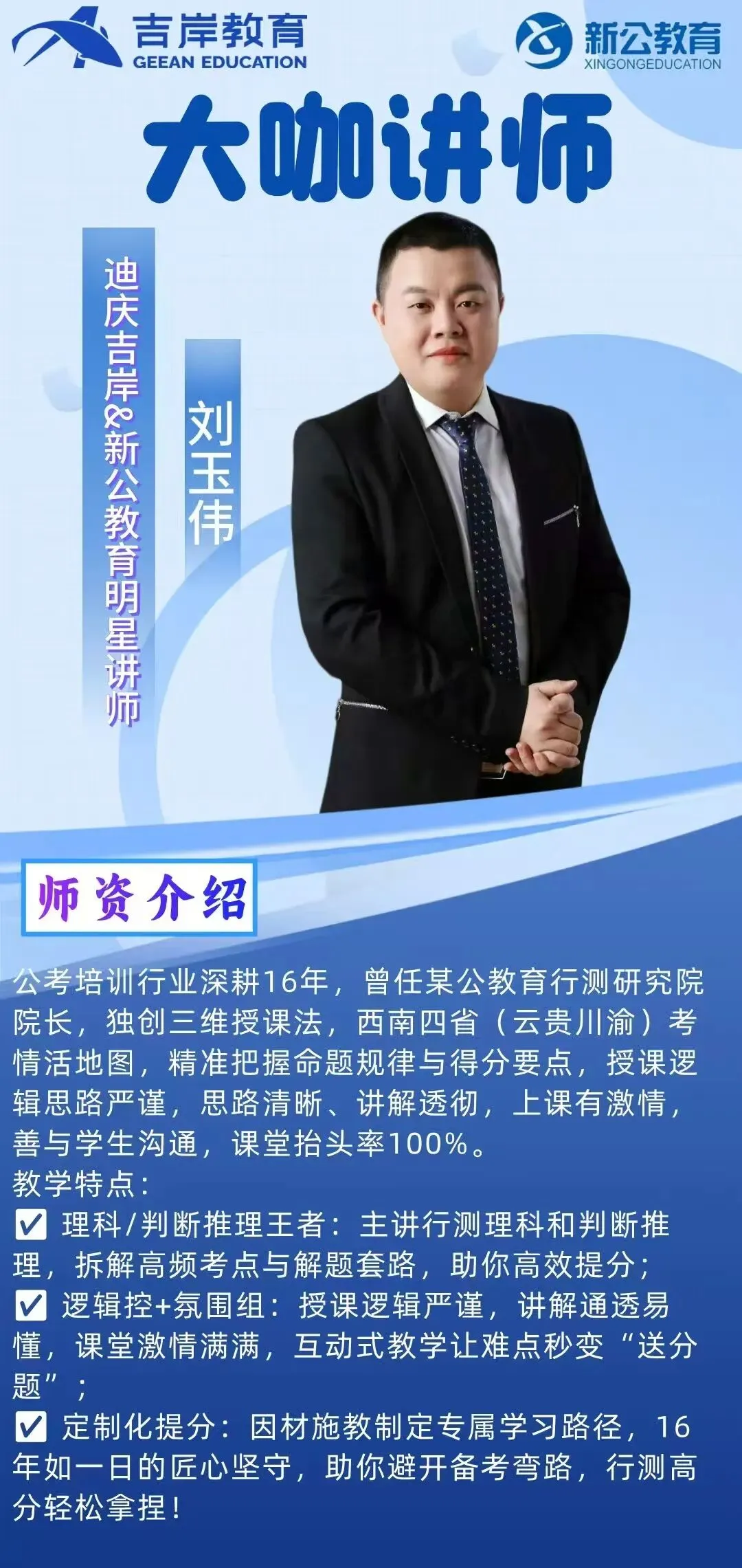 迪庆吉岸&新公教育,经营团队与授课教师均为云南本土公考行业资深从业者,平均教龄8年以上,教研功底扎实、授课经验丰富,精准把握云南各类公职考试命题规律。