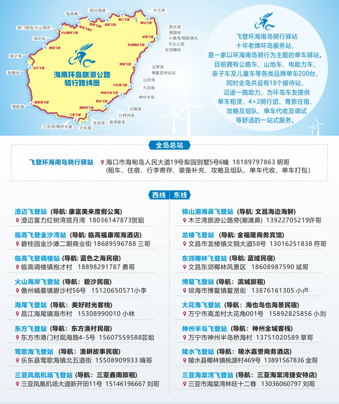 住宿:飞登环海南岛骑行驿站 床位40-45,标间80-120,18189797863 明哥 (租车免费颁发环岛奖牌和证书、单车打打包及邮寄)