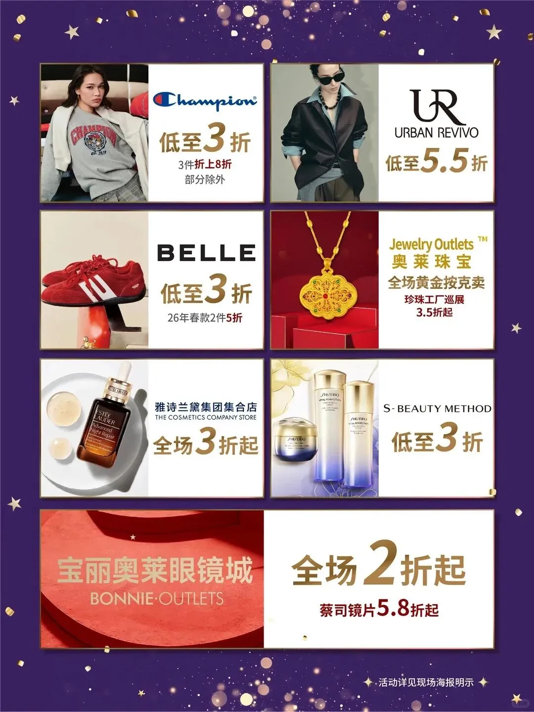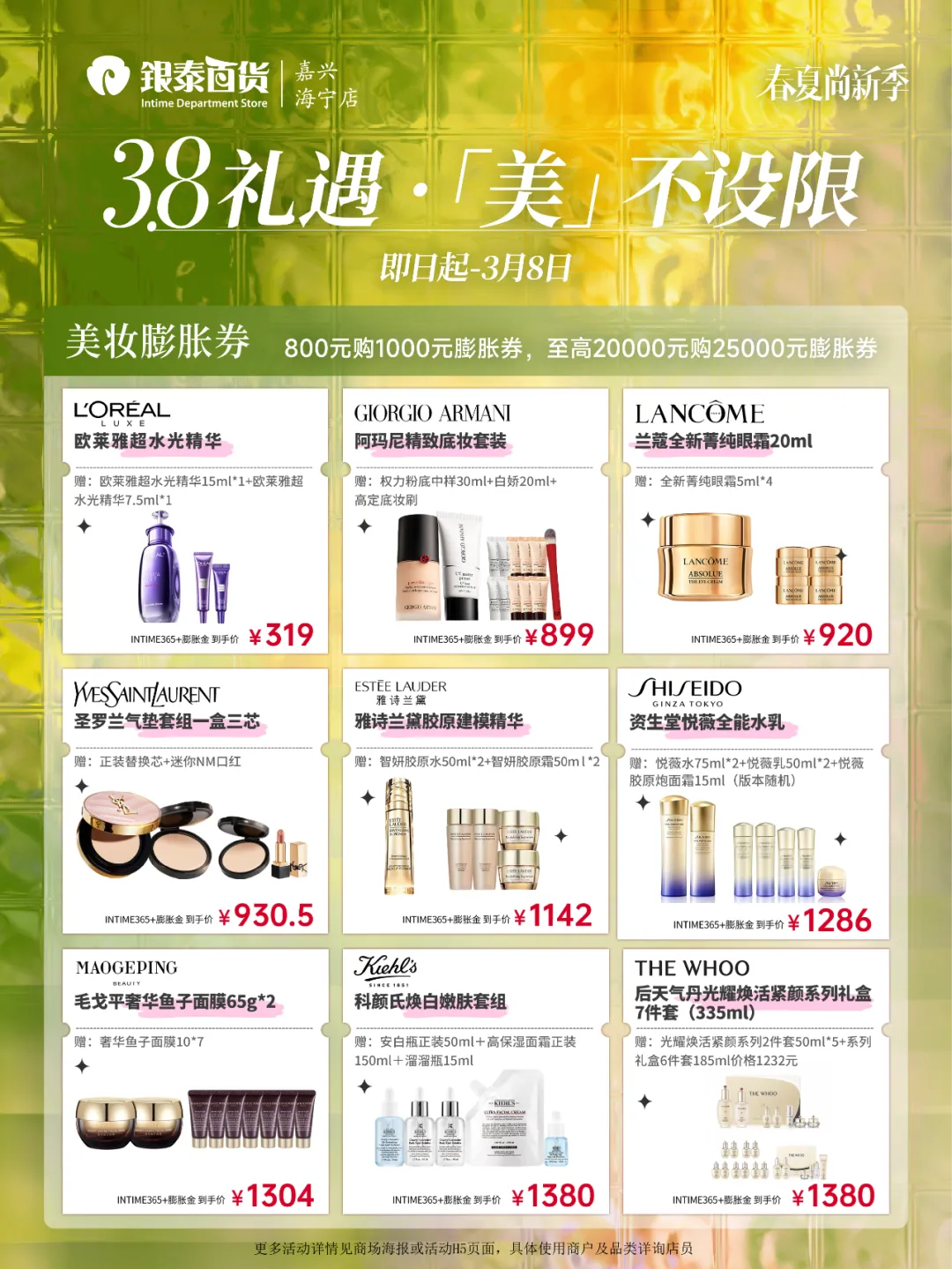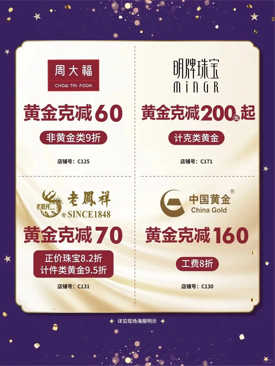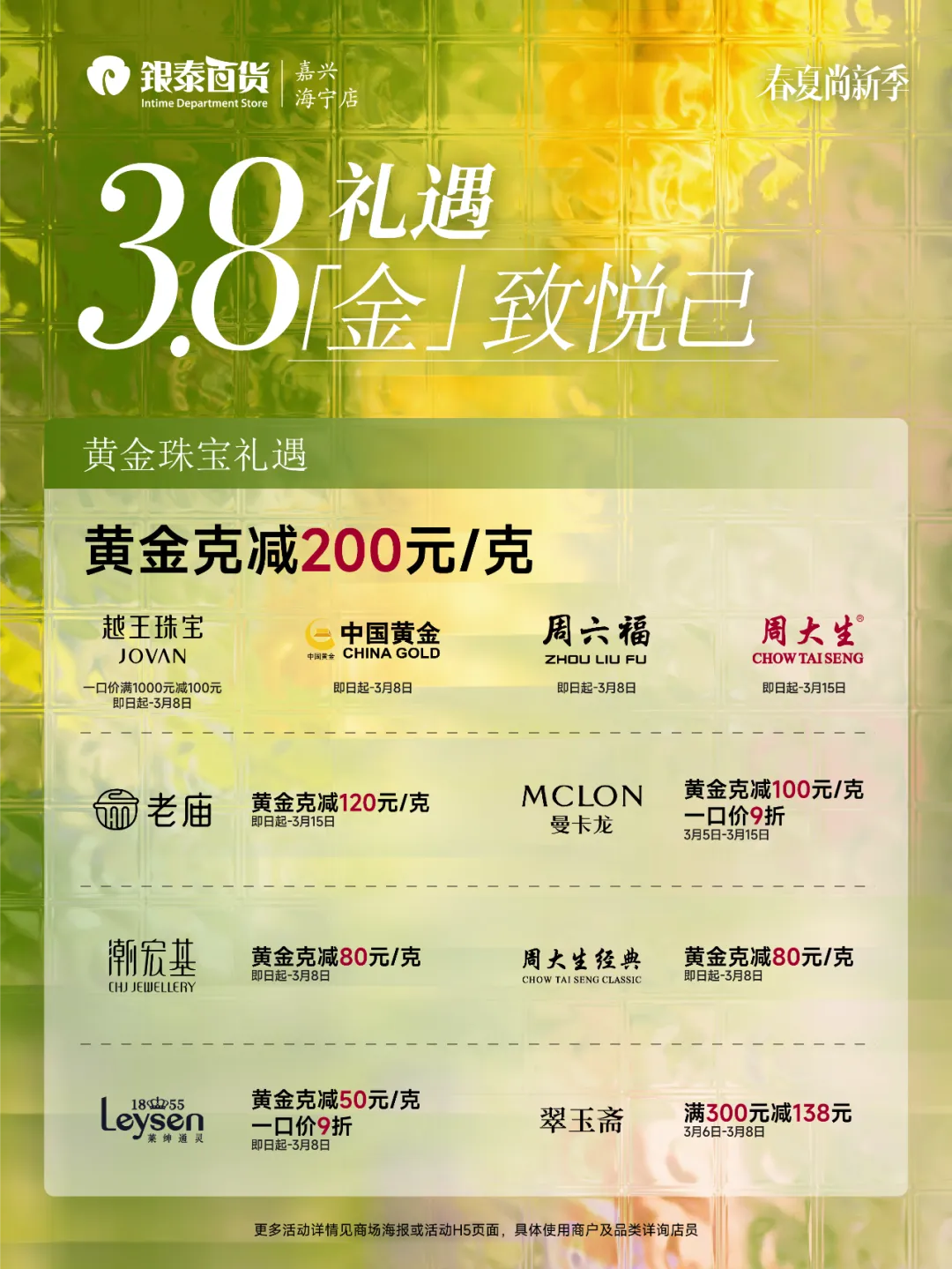 活动内容:美妆膨胀券,800购1000元膨胀券,至高购25000元膨胀券;诗凡黎、飞鸟和新酒女装低至5折;内睡衣超值满减!中国黄金、周六福等黄金克减200;更多活动细则详见海报。