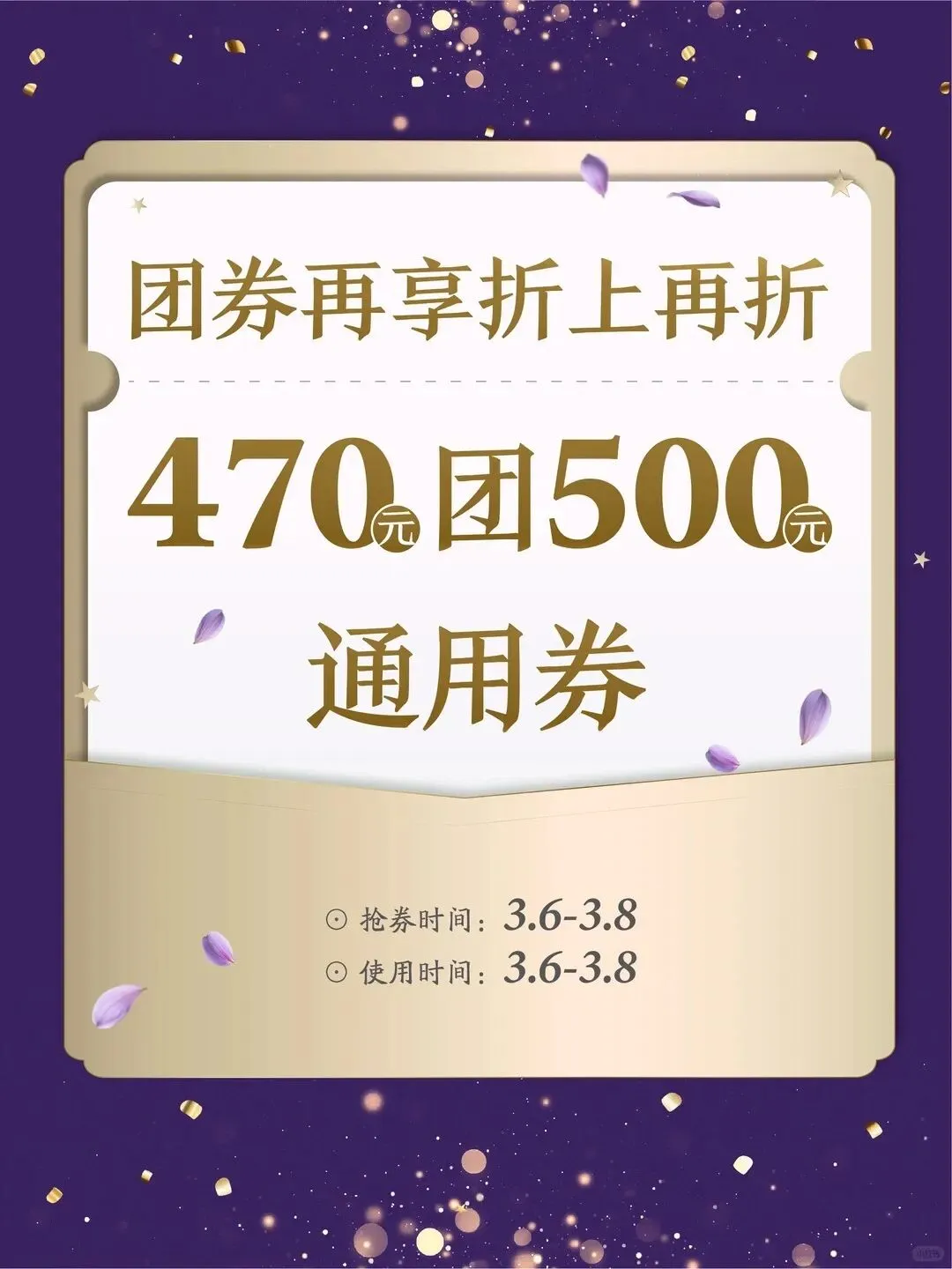 活动内容:超多品牌福利折扣;更有470元团500元通用券,等于在门店优惠基础上,再打9.4折;更多活动细则详见海报。