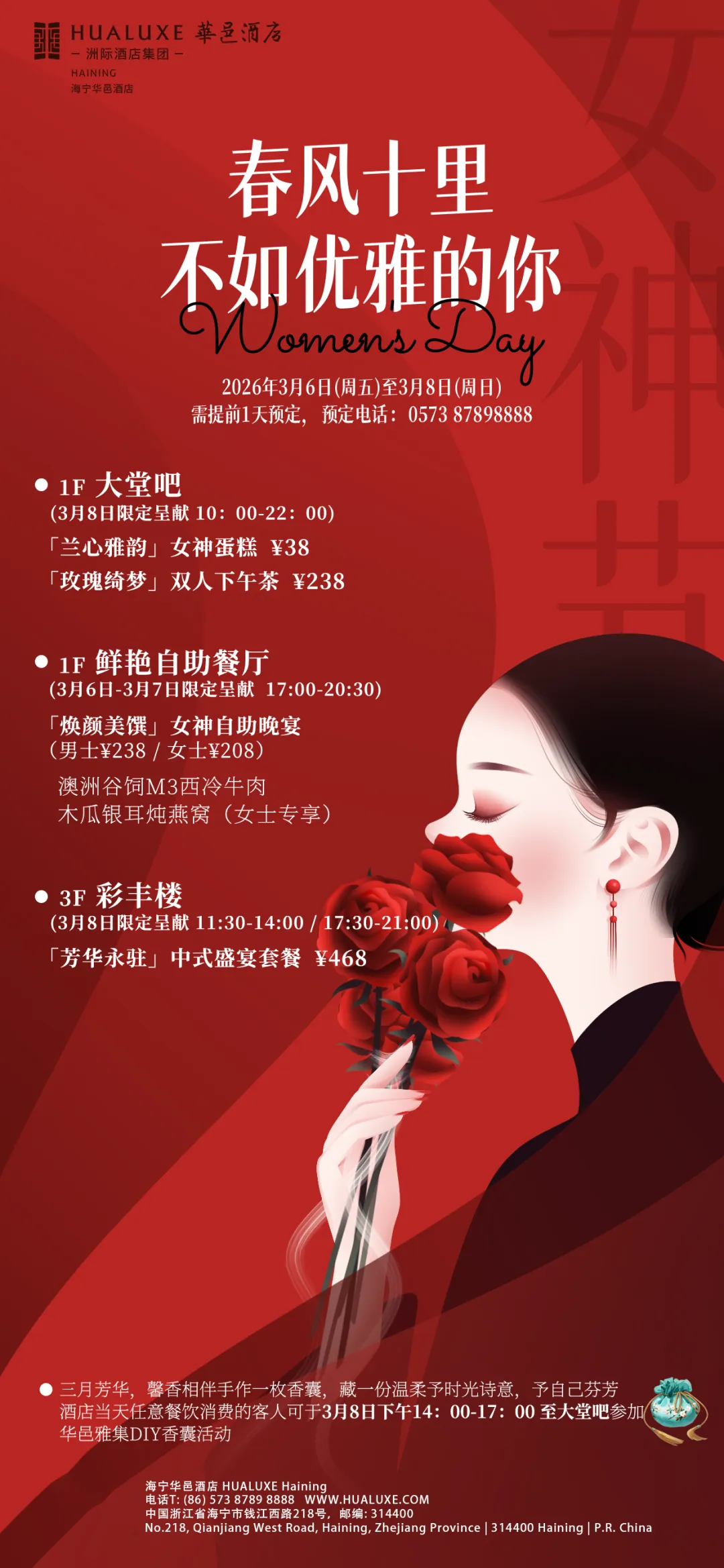 活动内容:兰心雅韵-女神4寸蛋糕,38元;玫瑰绮梦-双人下午茶,238元;芳华永驻-中式双人套餐,468元;自助晚餐女神特惠价,208元。节日当天还有香囊DIY制作,更多活动细则详见海报。