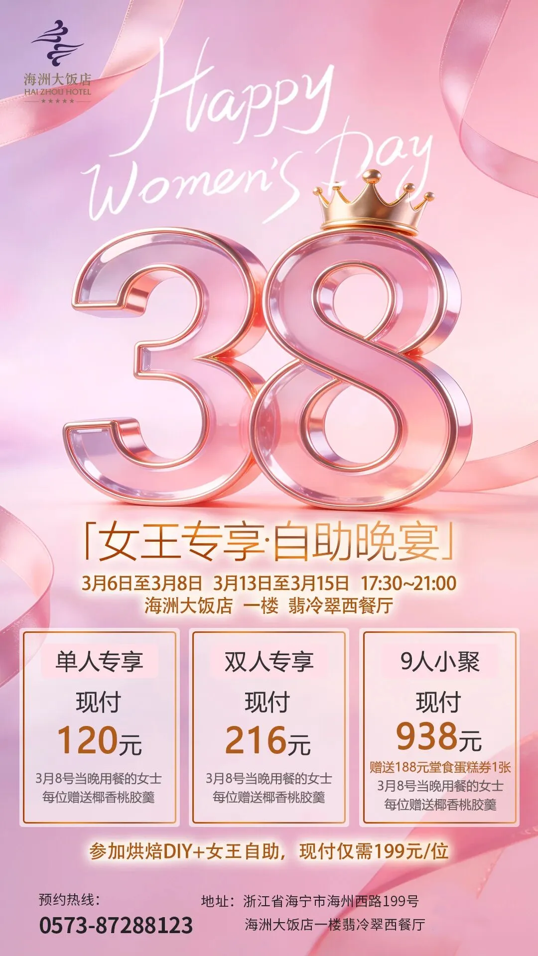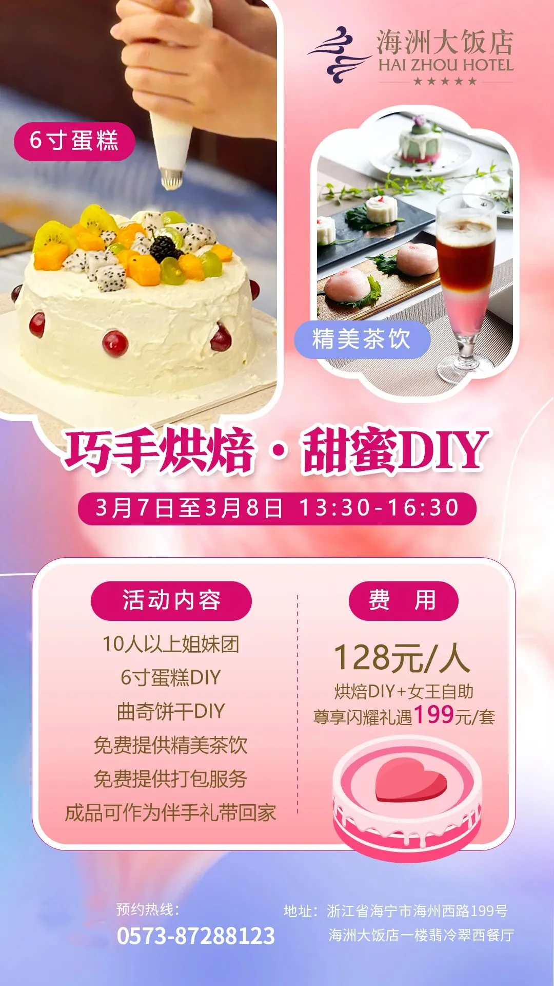 活动内容:巧手烘焙·甜蜜DIY,10人组团仅需128元/位;女王专享·自助晚宴,单人120元 | 双人216元 | 9人938元并赠188元堂食蛋糕券;烘焙DIY+自助晚宴同享,仅需199元/位;更多活动细则详见海报。