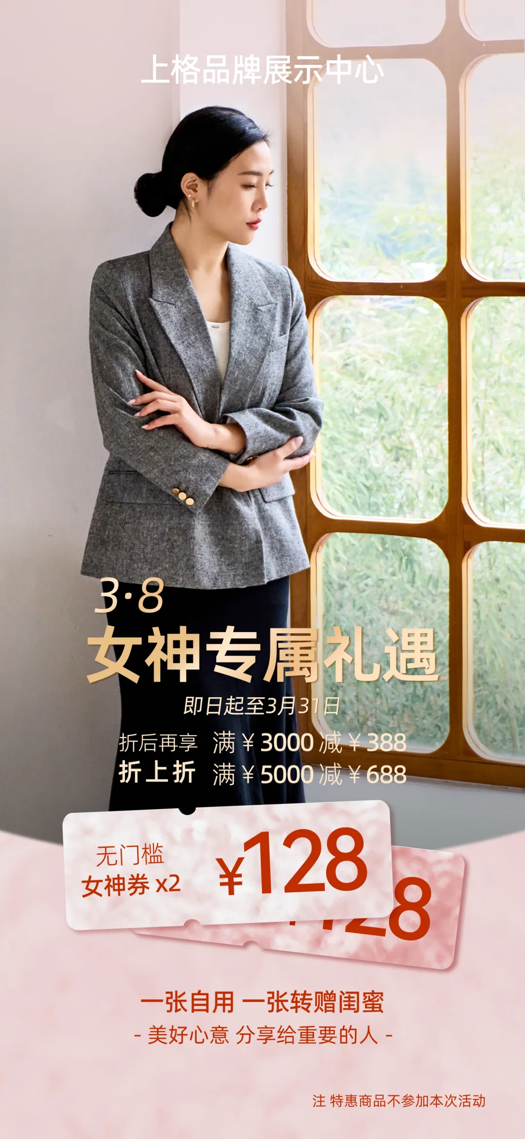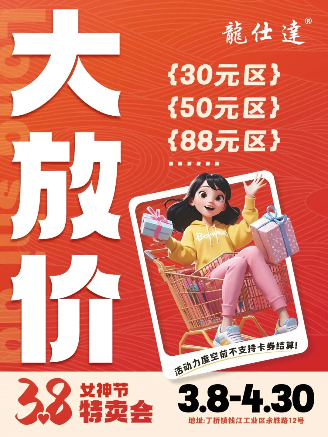 活动内容:3.8女神节特卖会,打底裤30元,裤子30-99元,打底衫30元,厚款背心30元;外套50-100元,部分打8折,详情移步店内了解。