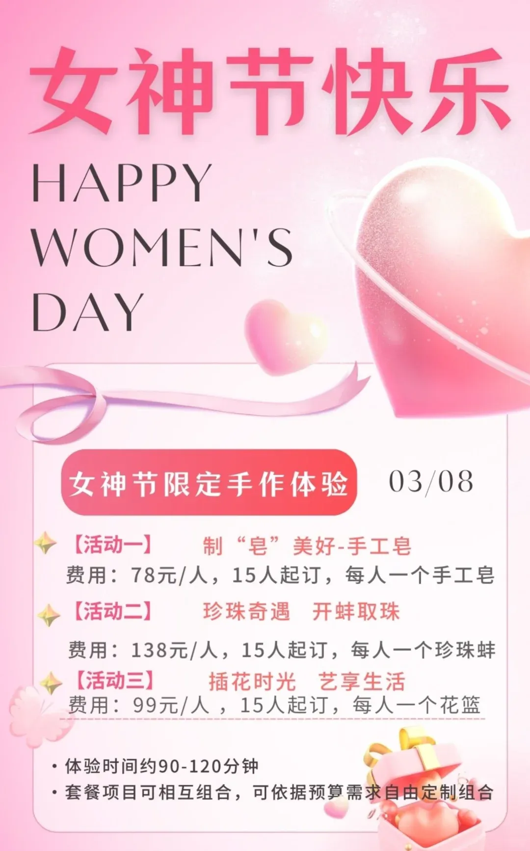 活动内容:女神节限定手作体验,制“皂”美好-手工皂、珍珠奇遇-开蚌取珠、插花时光-艺享生活,来这里做不被定义的自己。