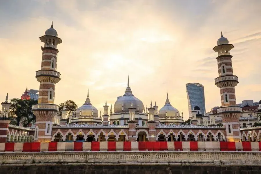 马来西亚历史上最悠久的清真寺,于1909年落成,位于巴生河和鹅麦河汇流地点,融合了印度与摩尔式建筑风格,白色的屋顶与橘色拱门有别于一般清真寺,但同样不失严气氛热闹,是当地最常前往朝拜的寺庙。