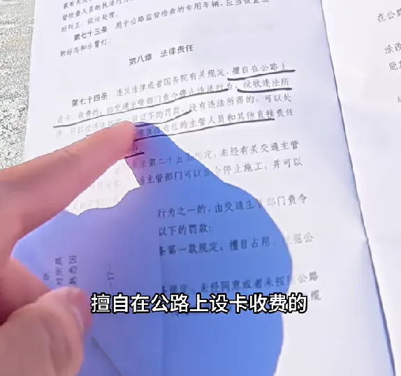 文件上写着《中华人民共和国公路法》第九条:“禁止任何单位和个人在公路上非法设卡、收费、罚款和拦截车辆。”