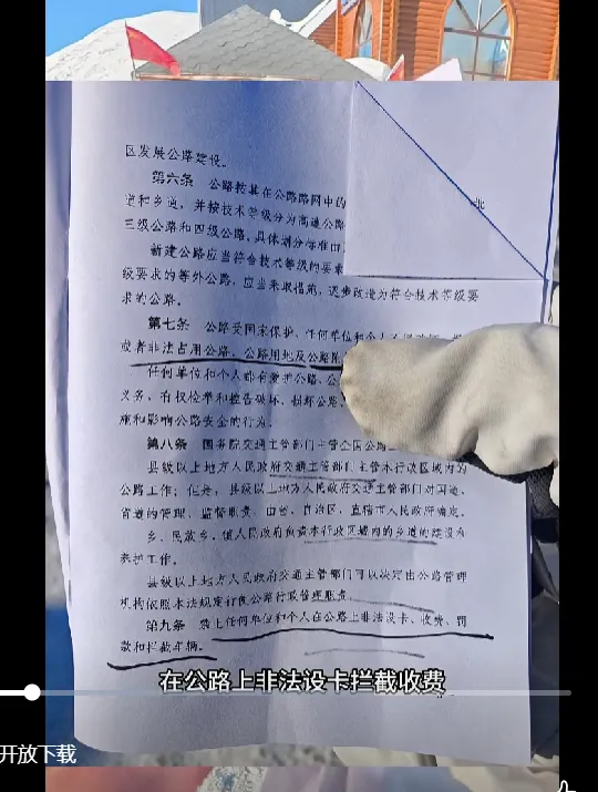 文件上写着《中华人民共和国公路法》第九条:“禁止任何单位和个人在公路上非法设卡、收费、罚款和拦截车辆。”