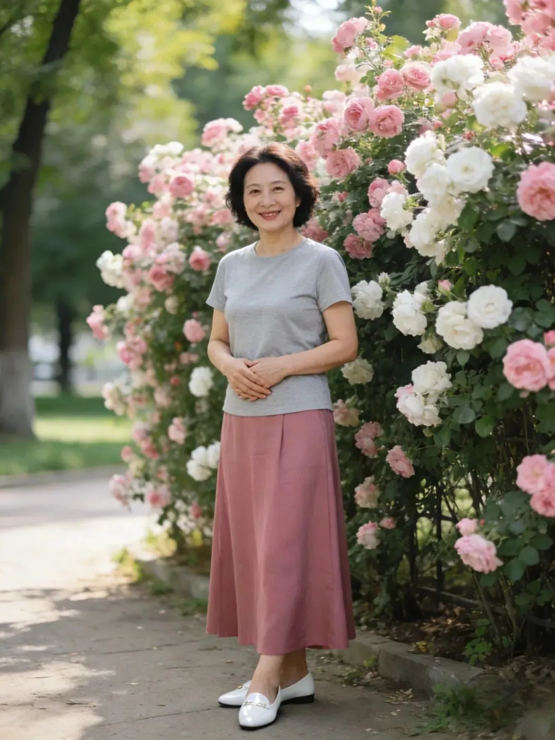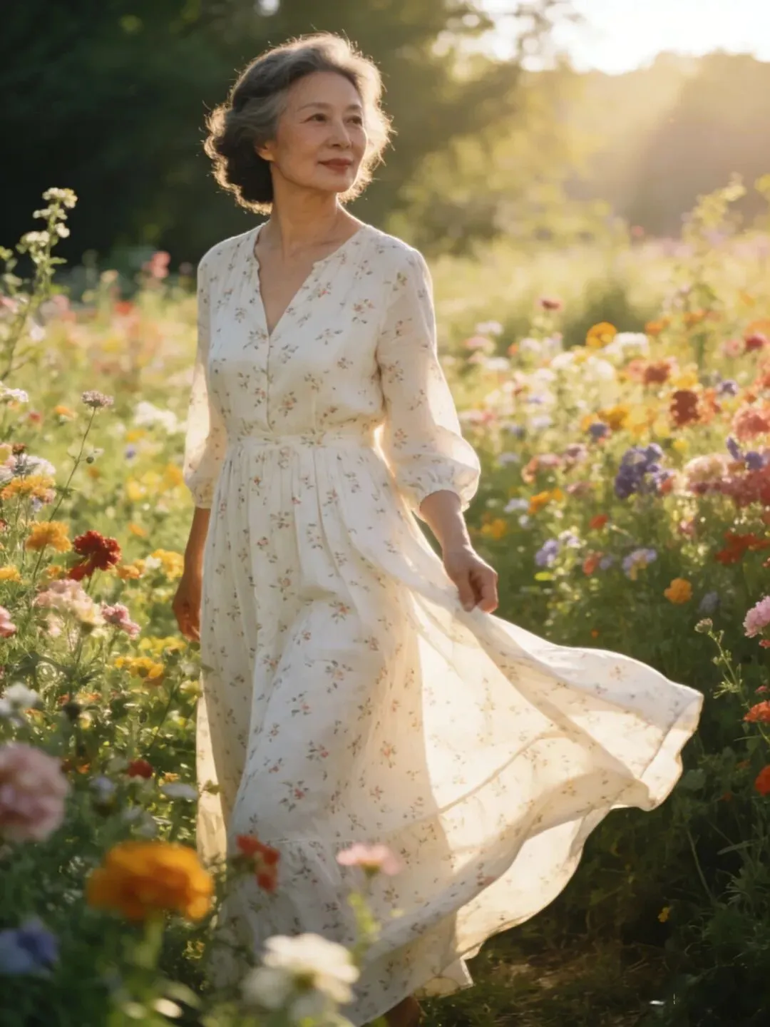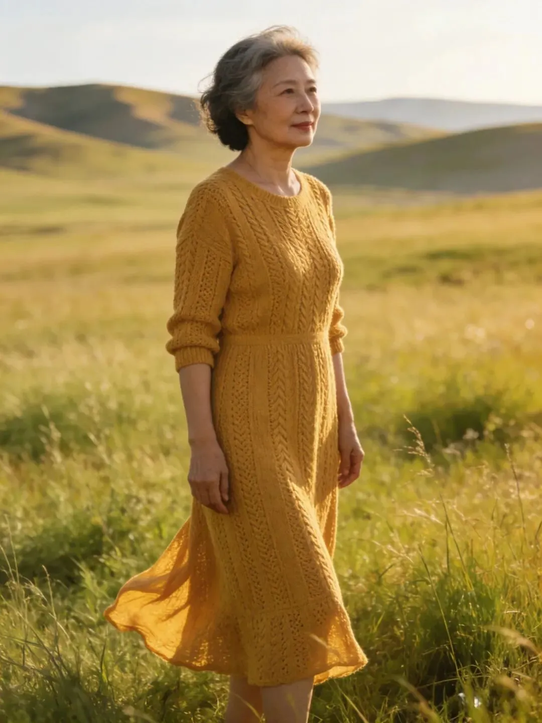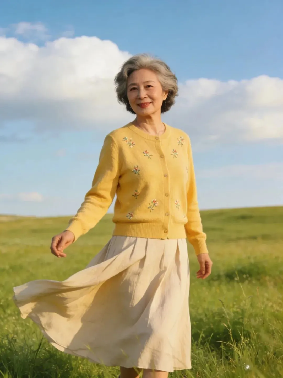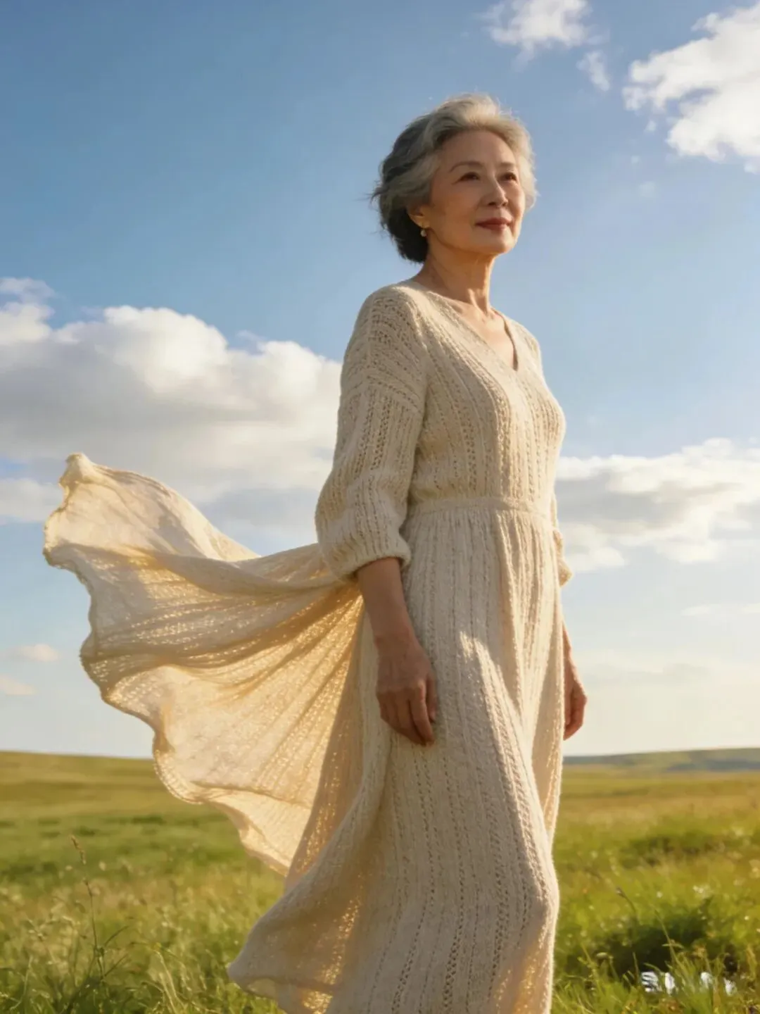 过了60岁,肌肉、皮肤都成下滑状态,松弛有下垂,腰部,手臂,大腿上最容易长肉了,穿长裙长可以遮肉,也会显得人端庄大方,优雅自然。