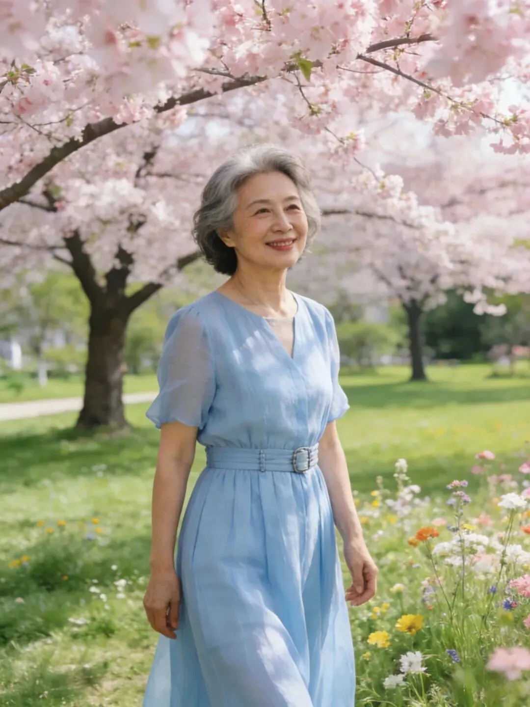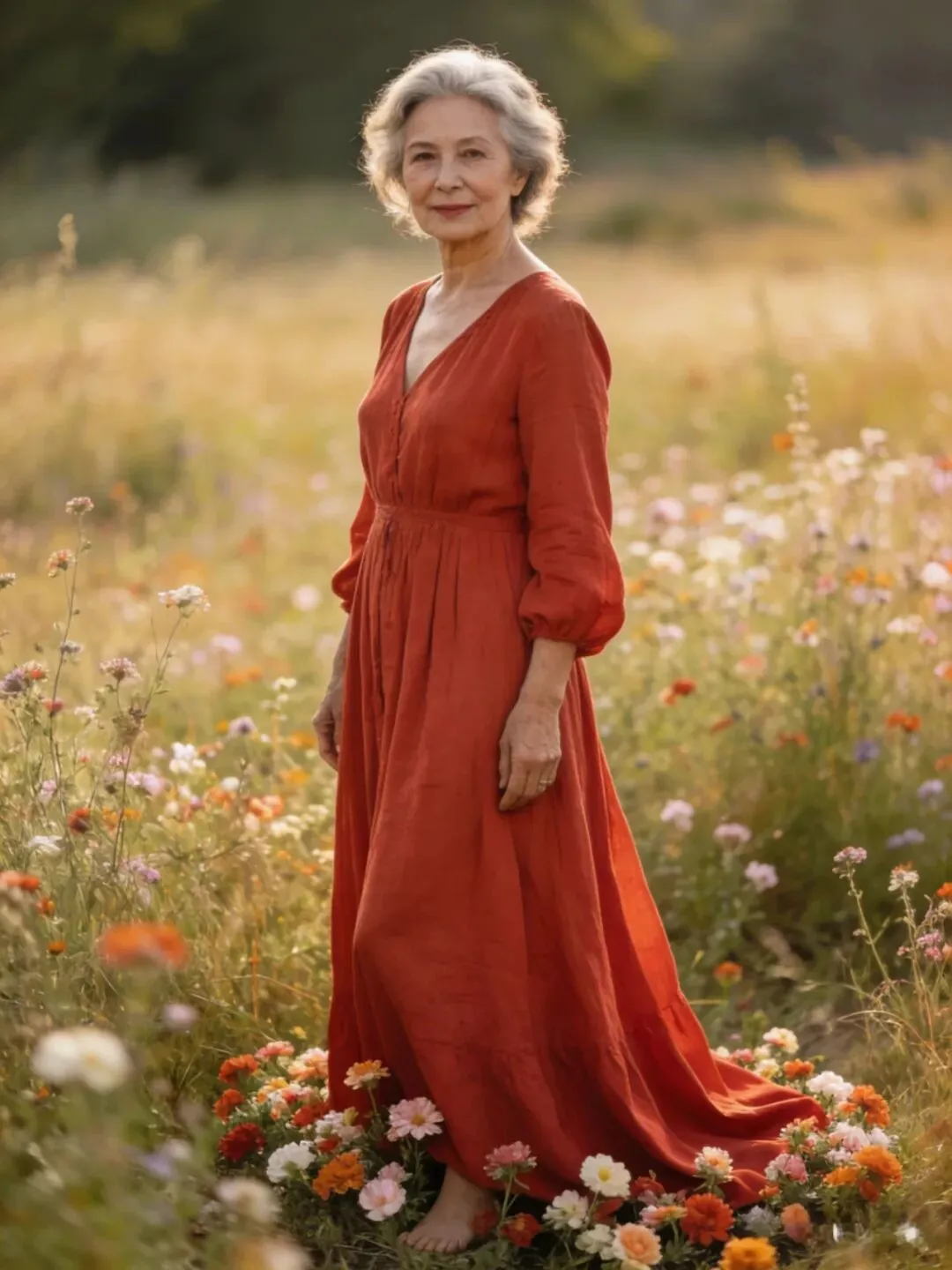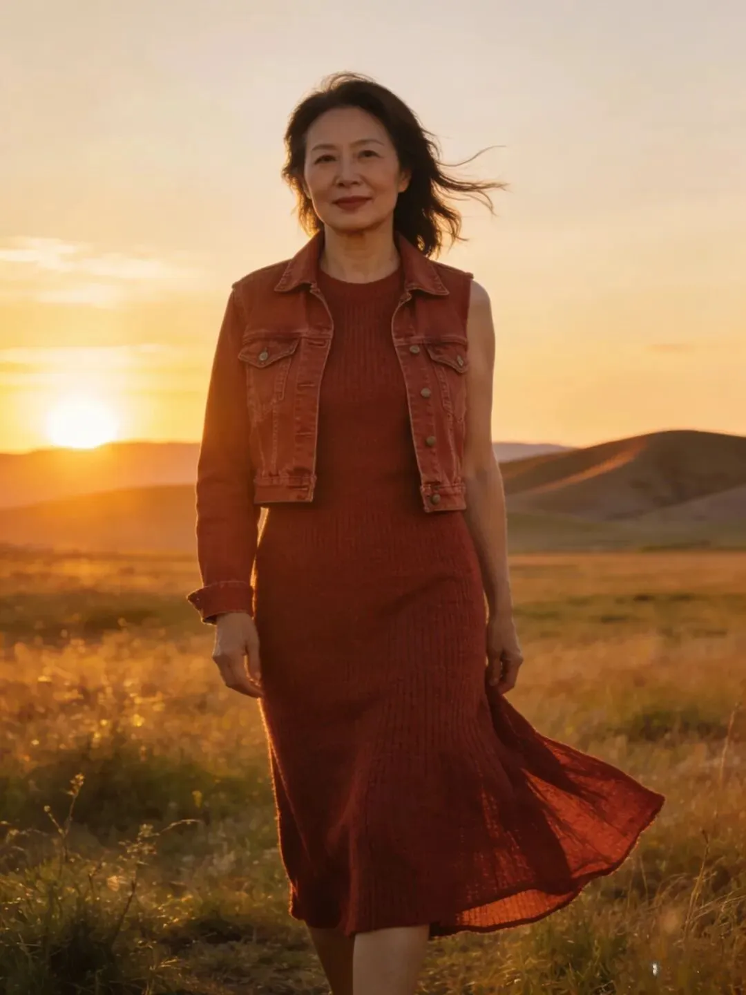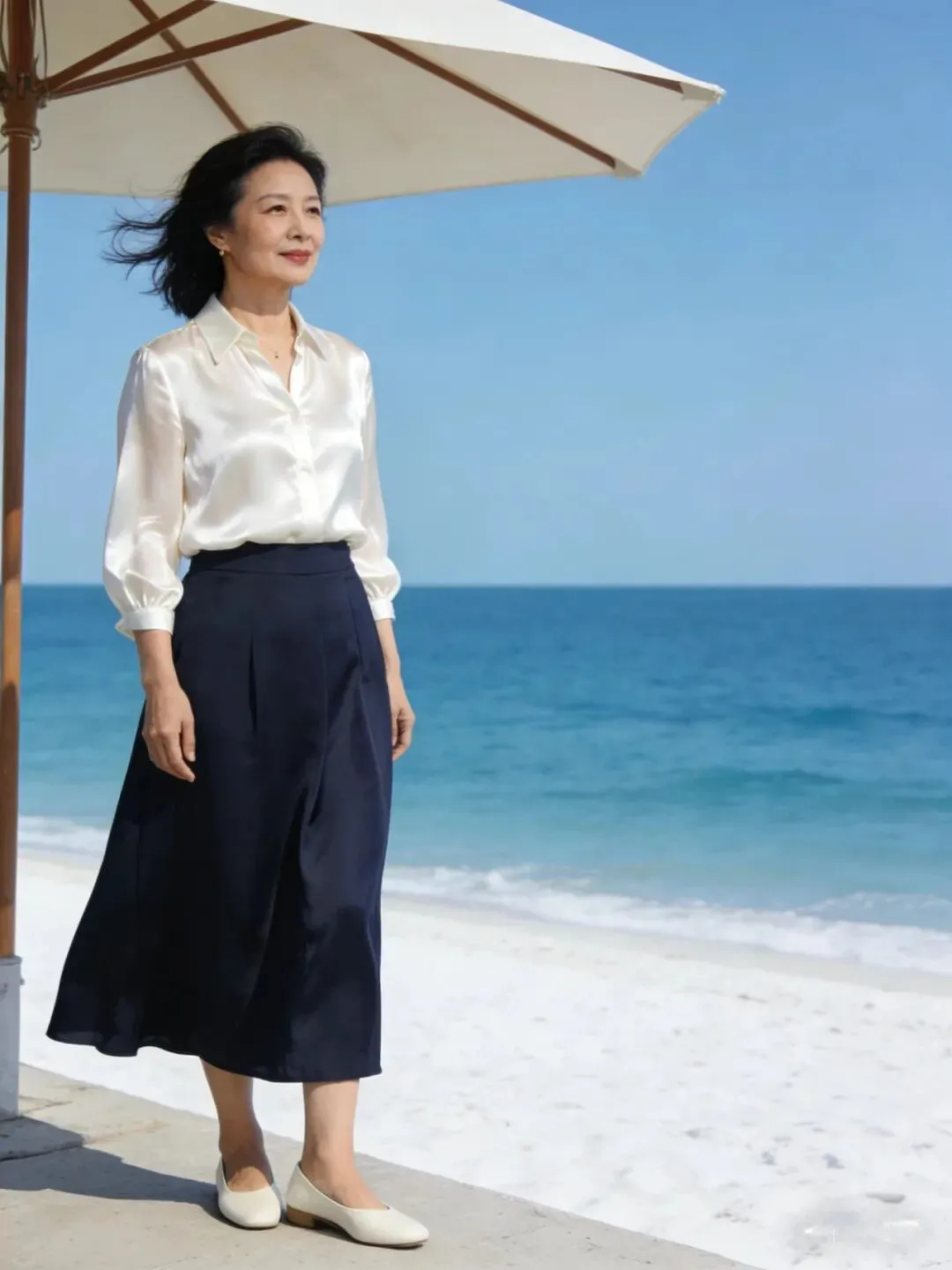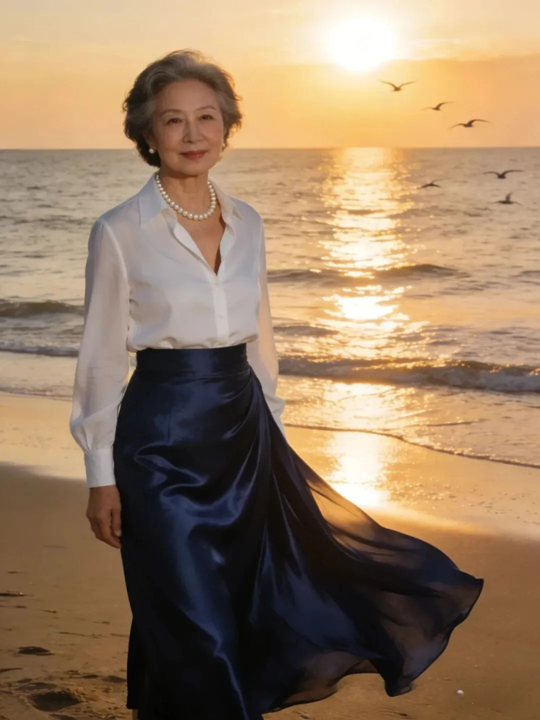 过了60岁,肌肉、皮肤都成下滑状态,松弛有下垂,腰部,手臂,大腿上最容易长肉了,穿长裙长可以遮肉,也会显得人端庄大方,优雅自然。