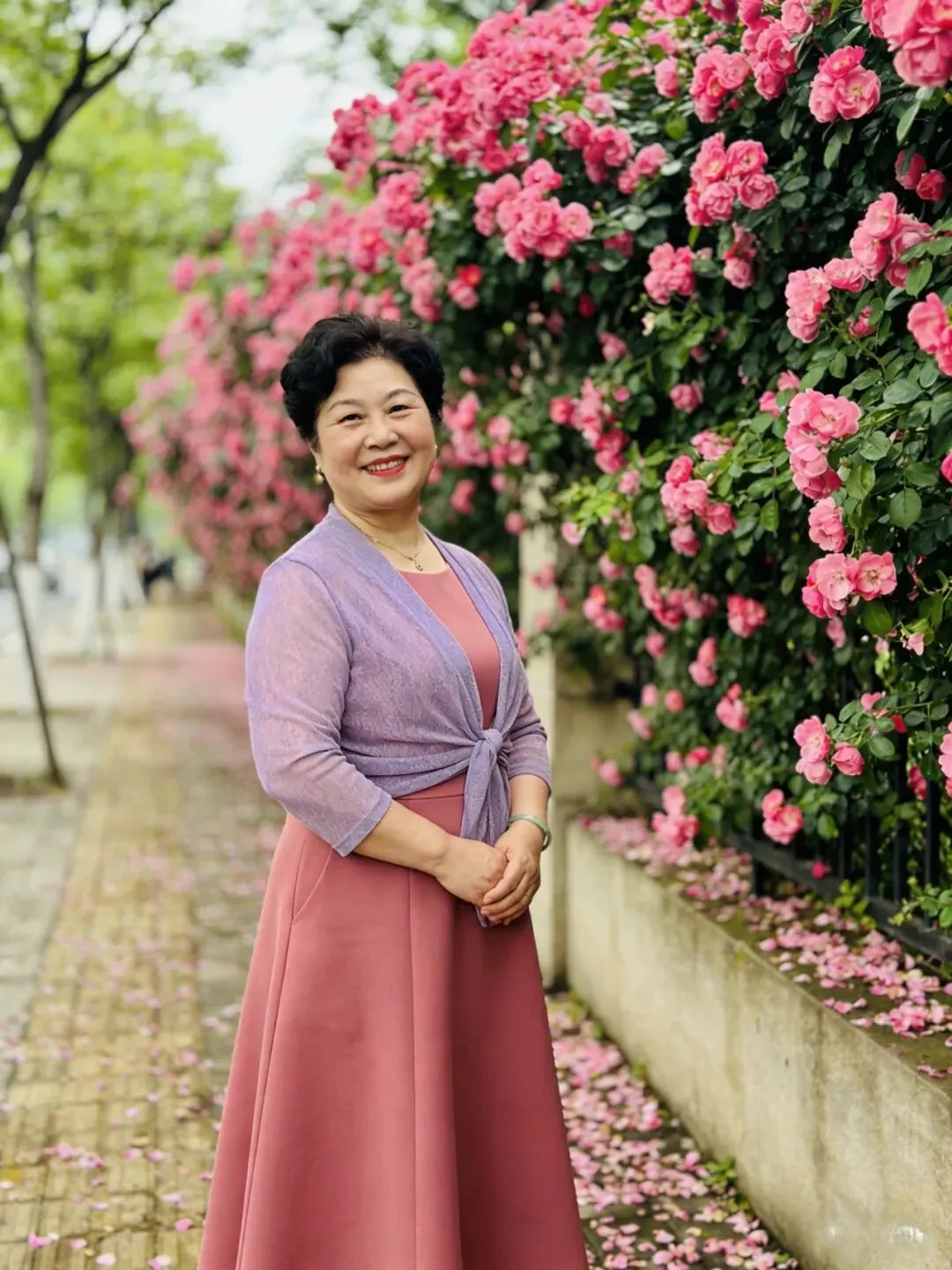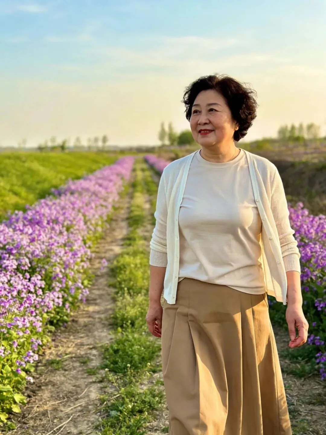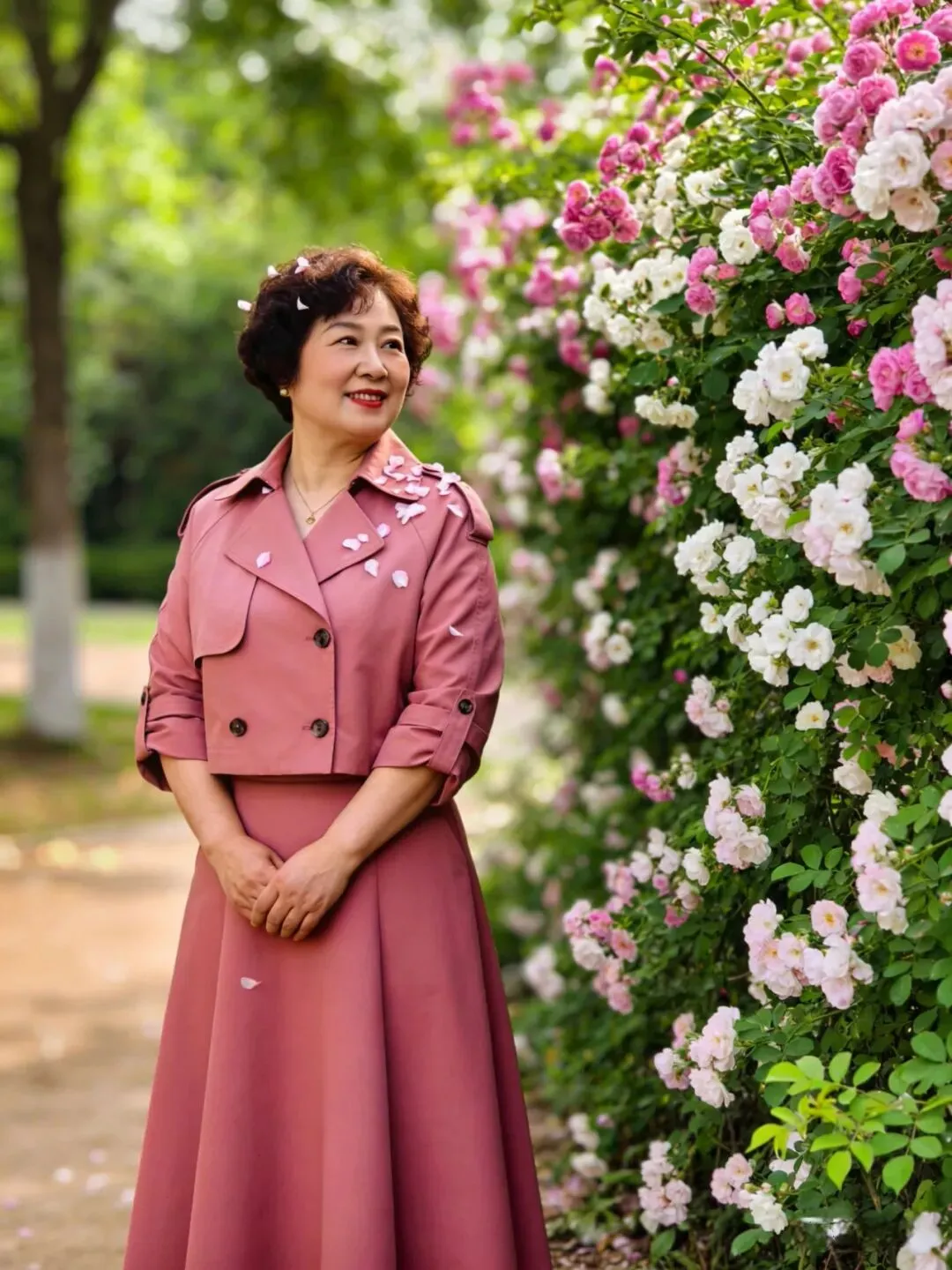 上了年纪的姐妹们大多都是皮肤发暗,拍照出来都会显得脸色不精神,这时我们可以穿一些明快颜色衣服来衬托肤色。