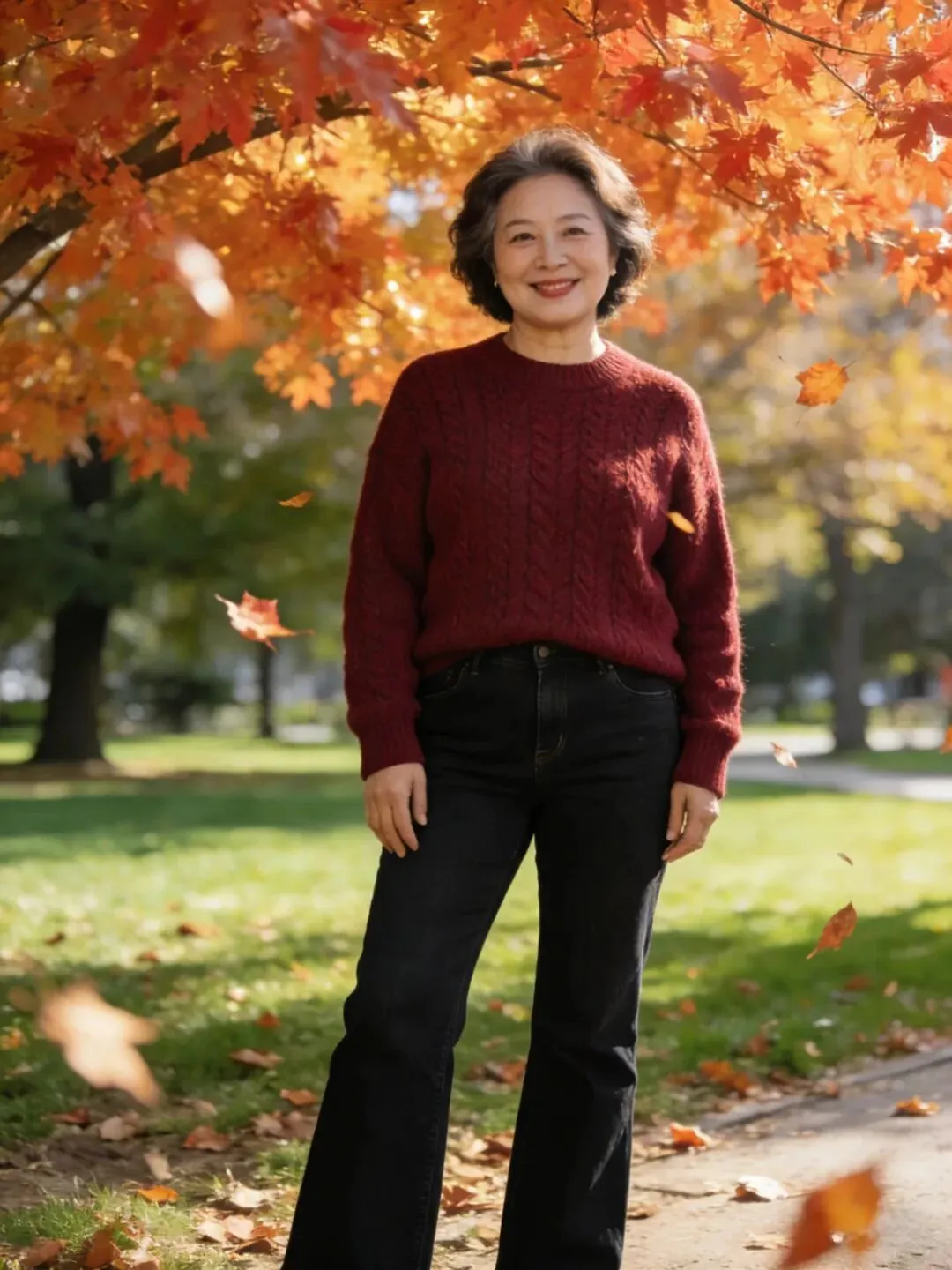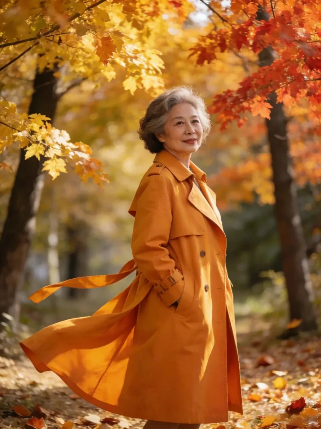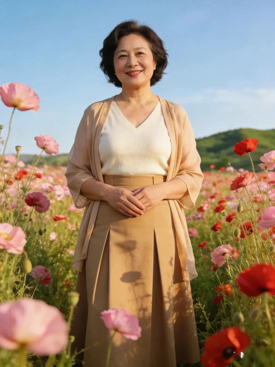 上了年纪的姐妹们大多都是皮肤发暗,拍照出来都会显得脸色不精神,这时我们可以穿一些明快颜色衣服来衬托肤色。