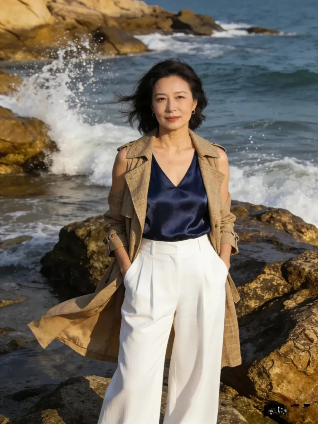 那些刚好遮住腰腹、手臂小赘肉的衣服,可以遮盖缺点,显得大方又自然。拍照也大气。