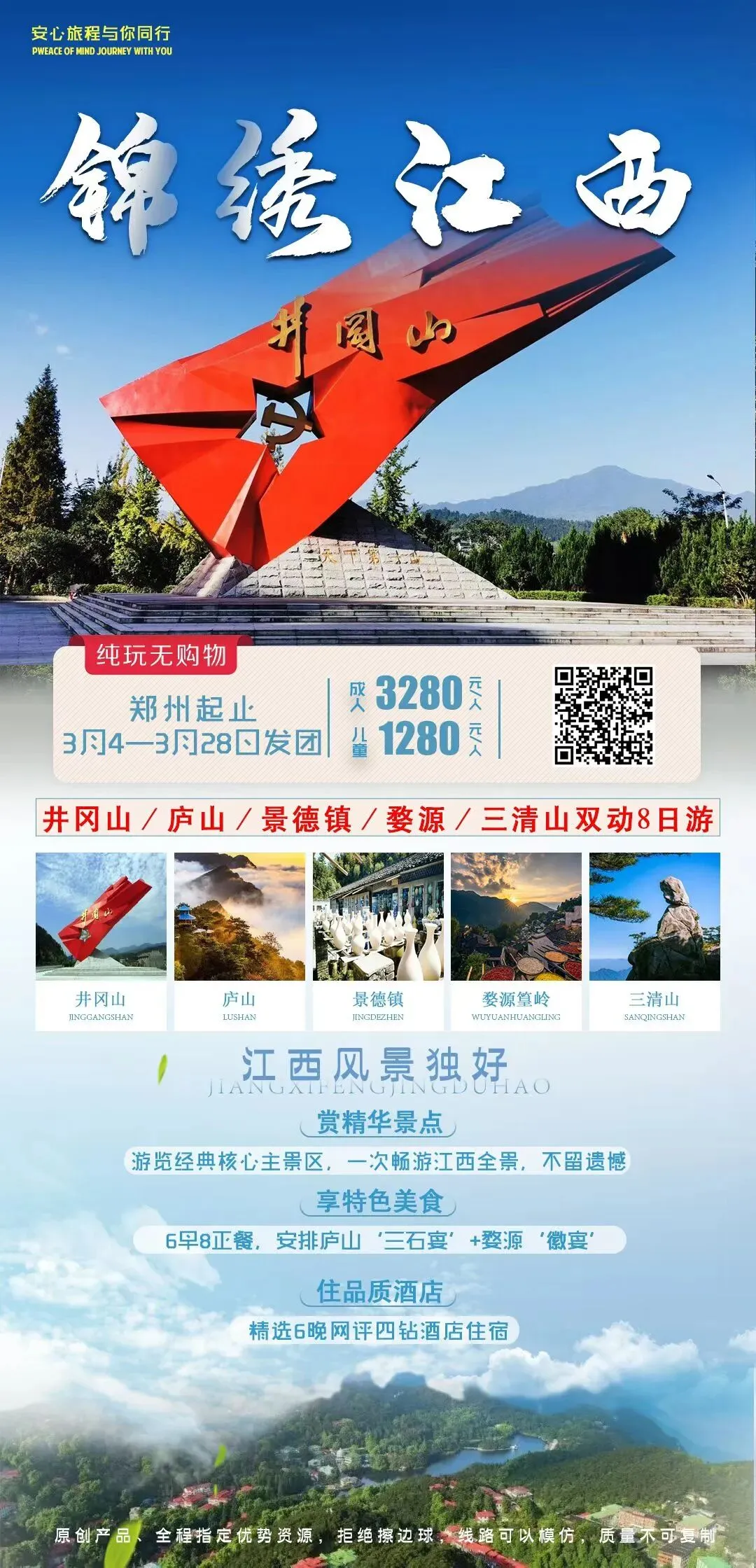 ‼️庐山踏青+婺源油菜花海+景德镇+三清山+抚州+南昌+井冈山+瑞金8日游(一走次遍不留遗憾 高品0购0自费推荐 独家安排瑞金产品)