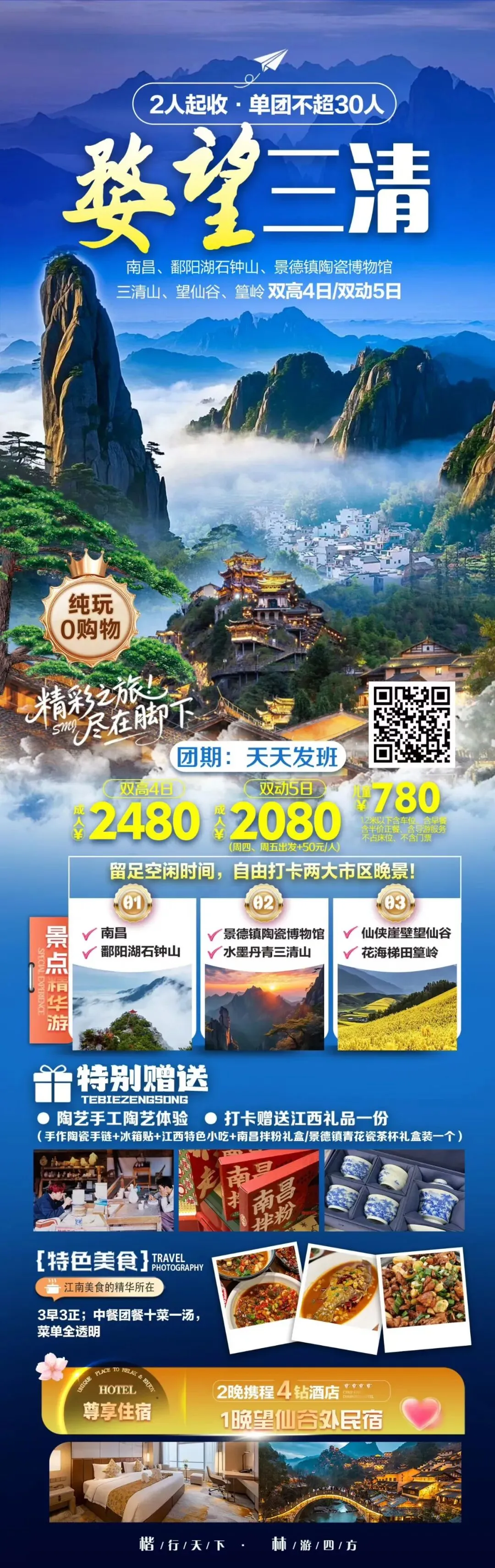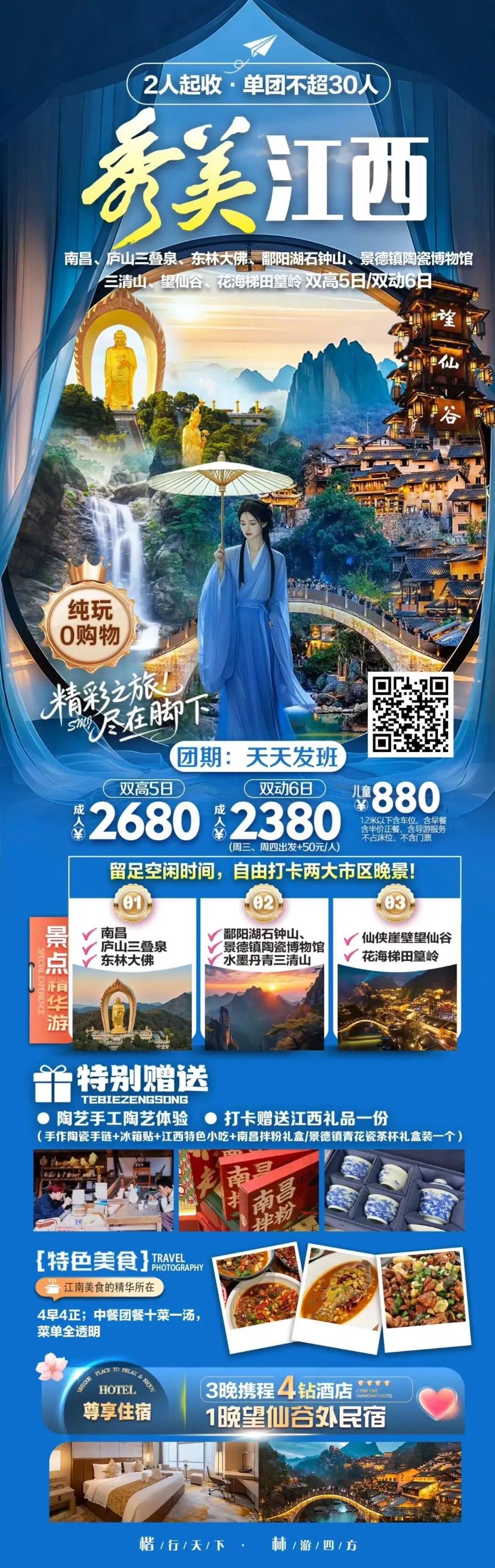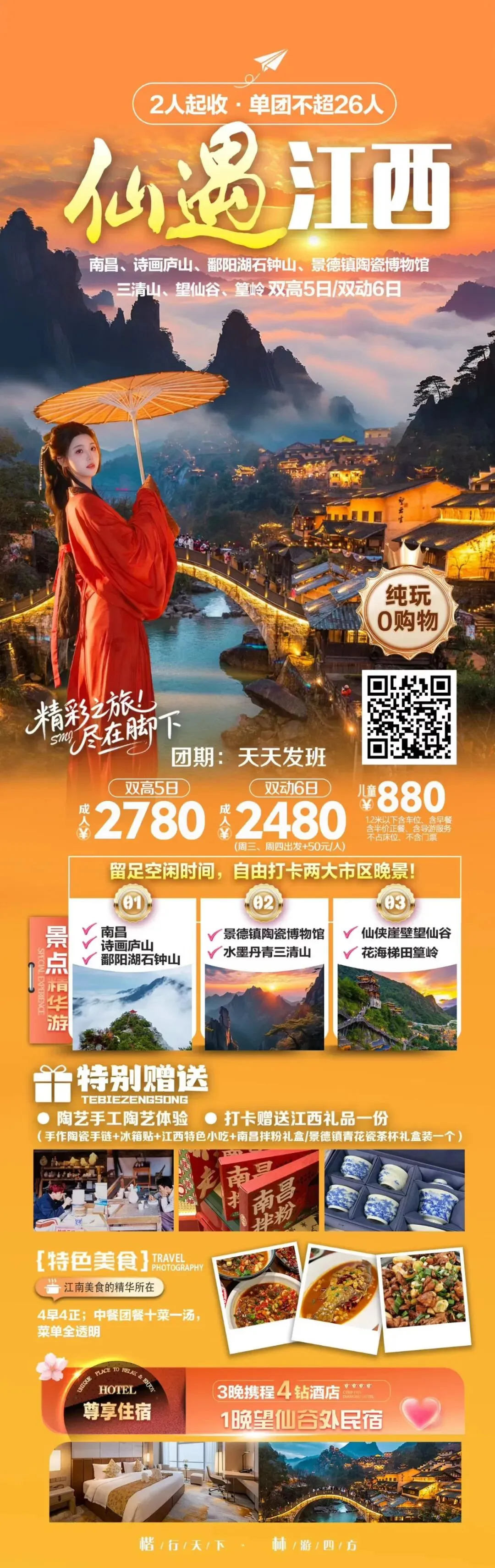 ✅婺源篁岭+婺女洲/景德镇/三清山/葛仙村/南昌双卧6日/双高5日