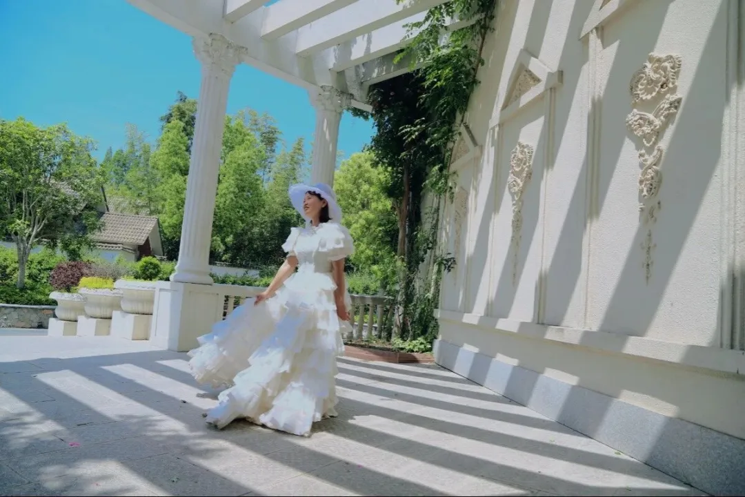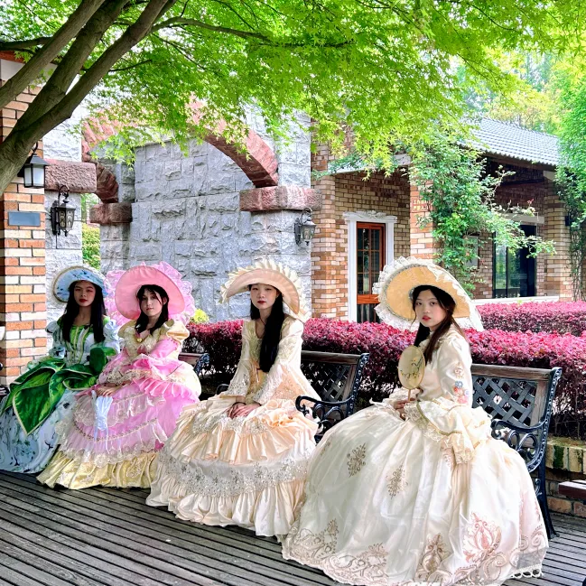 景区为30人以上的姐妹团准备了宫廷服装拍摄。换上蓬蓬裙,戴上礼帽,在城堡前、喷泉边、花园里走走停停,阳光洒下来,每一张都像公主的日常。