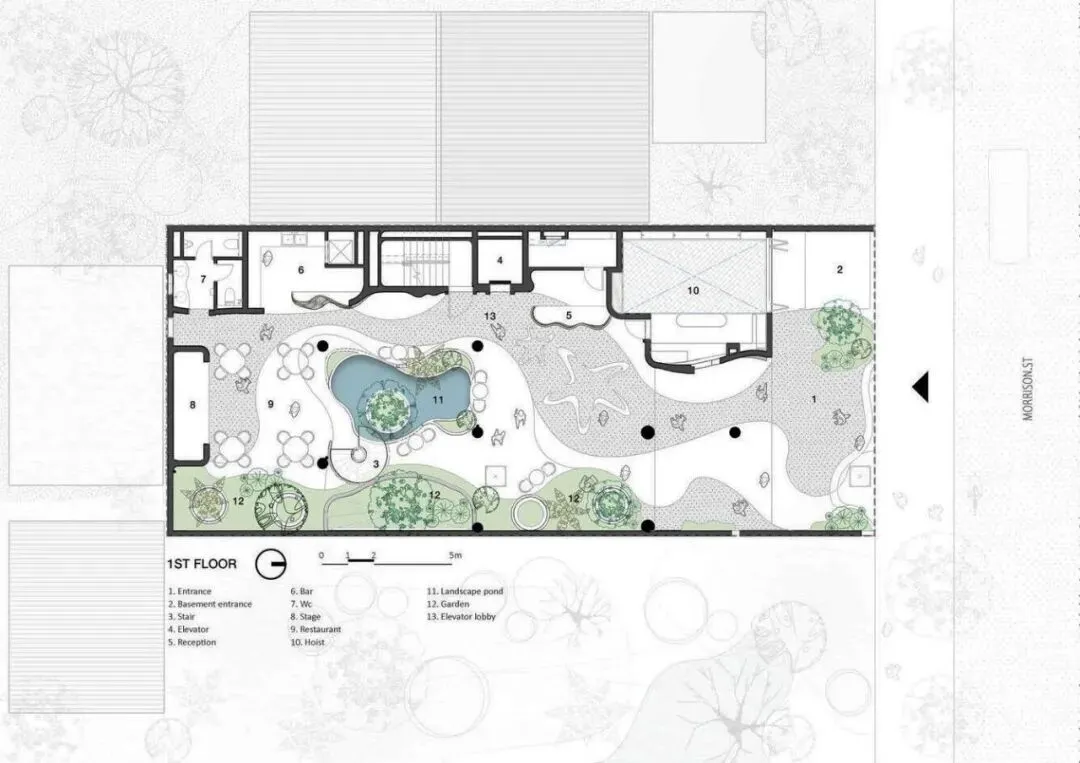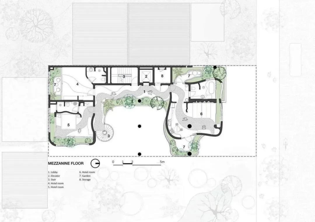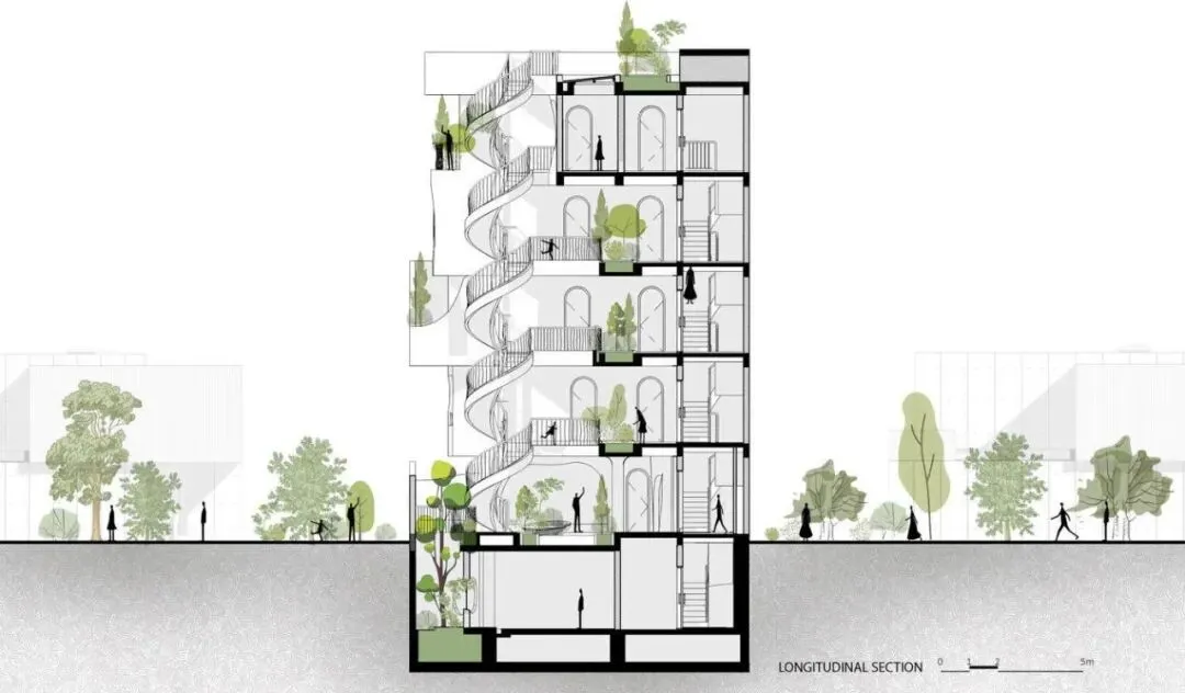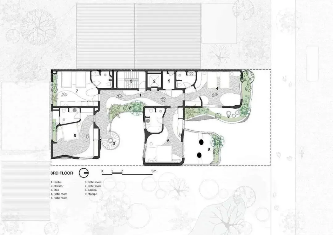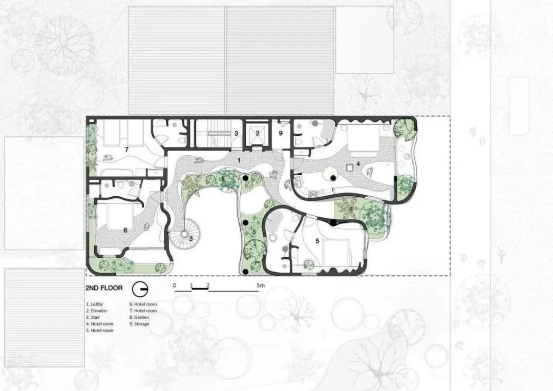 项目坐落于越南岘港主要干道之一莫里森街(Morrison Street)。在这座蓬勃发展的旅游城市快速发展的浪潮中,周边尽是玻璃幕墙的高档街区式酒店,而本项目却独辟蹊径,以一种即兴且极具艺术感的建筑语言,巧妙地发起了一场挑战。