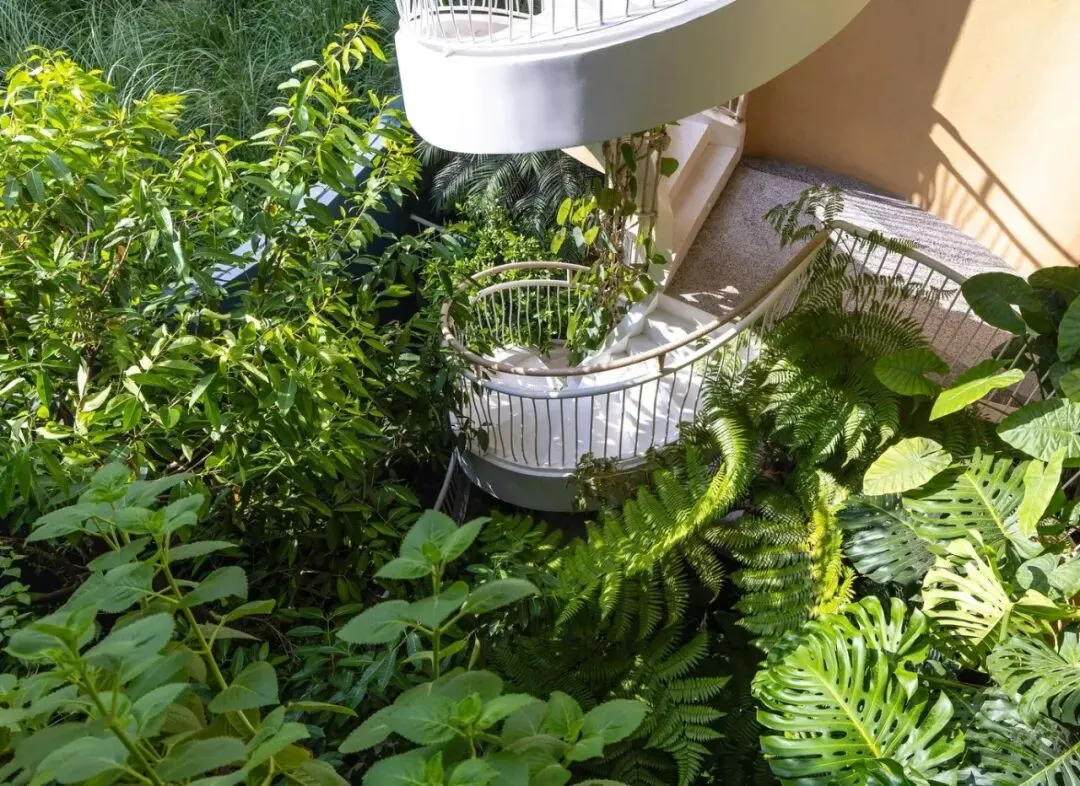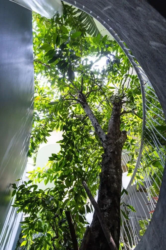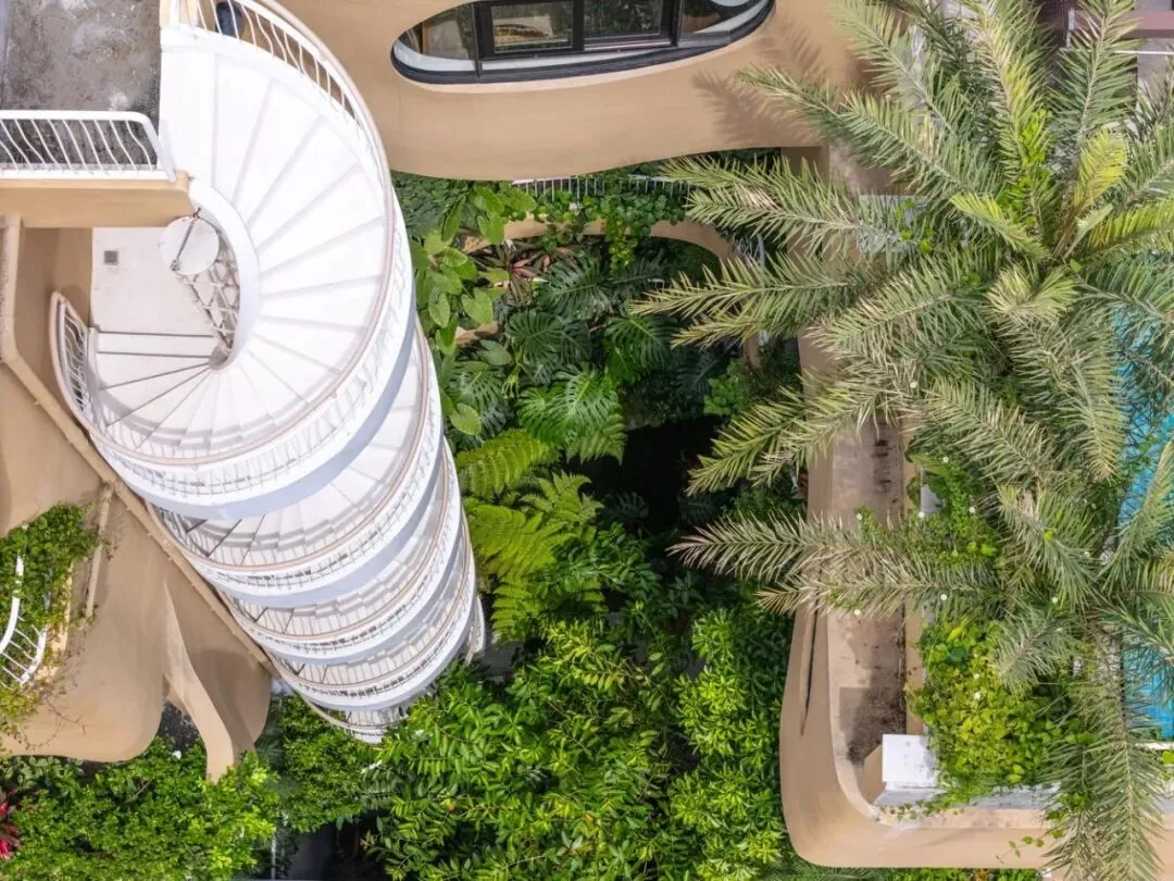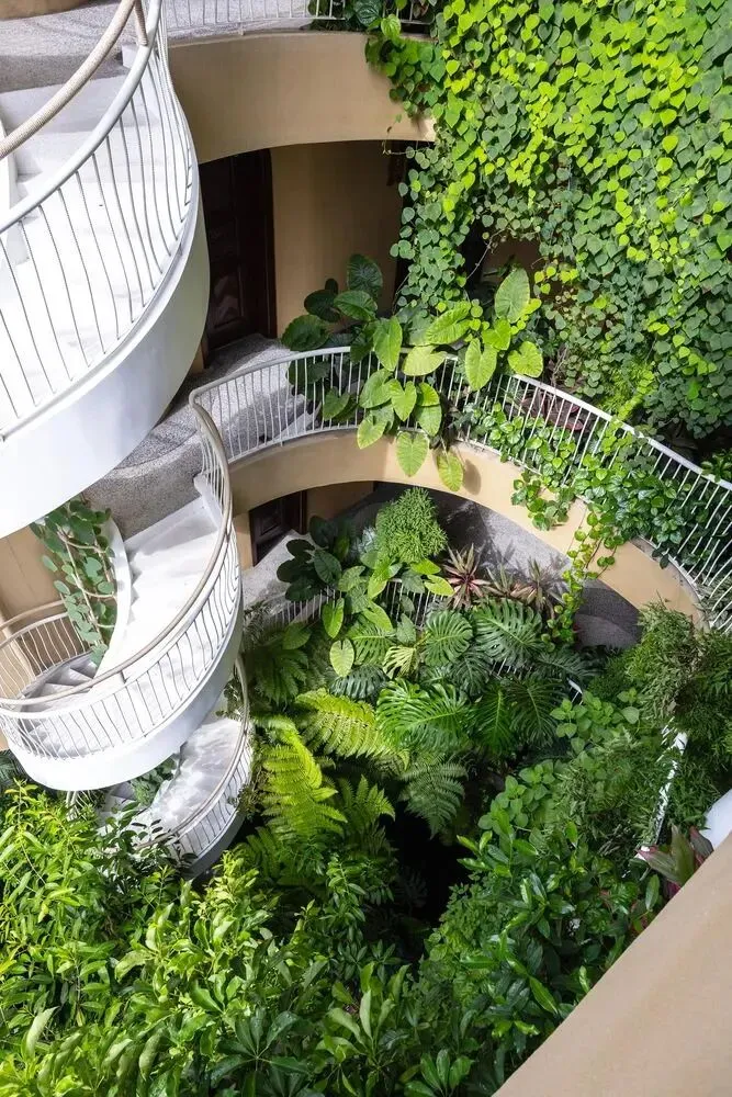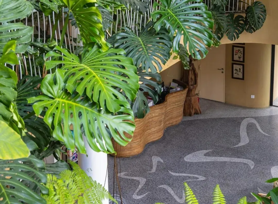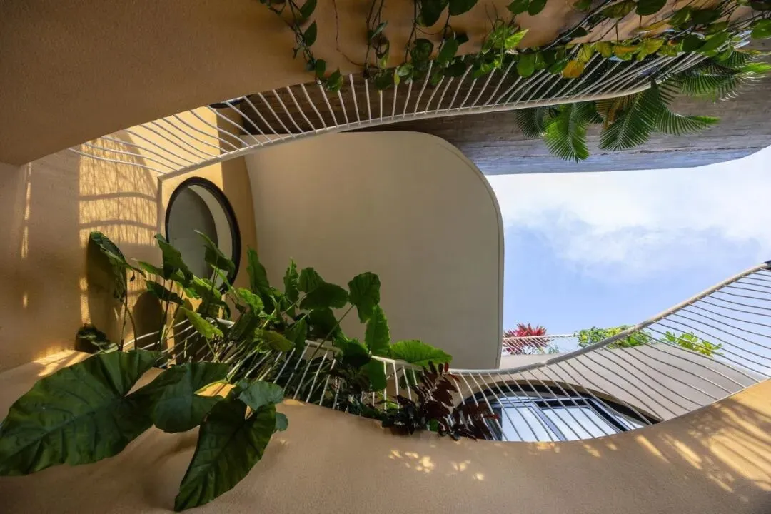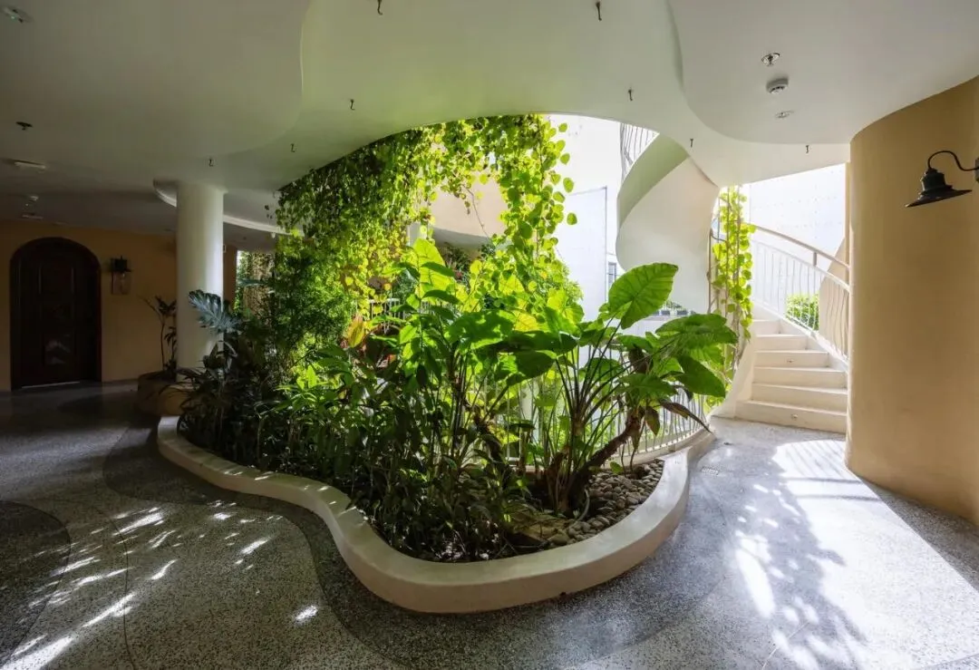一楼是一个精致优雅的开放式中庭。这里,一个美丽的鱼池与装饰性植物优雅交织,漂浮其中。开放的中央核心区让自然光线从上方倾泻而下。这一切共同营造出一片生机盎然之地。漫步在这座珍视的建筑中,环绕的色彩与热情的曲线时隐时现。