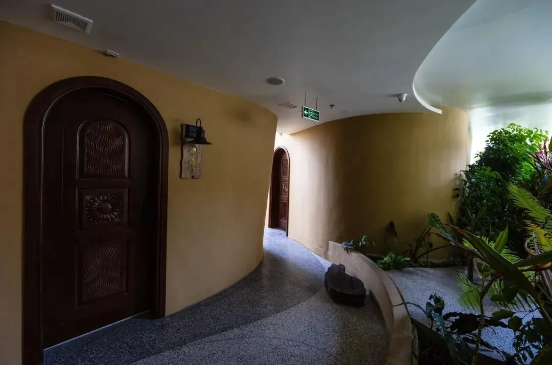 这是一家休闲设施,其流畅的有机曲线从自然中汲取灵感,建筑特色令人称奇。现有的沿海住宿项目多以玻璃方块和柔和色调为主,而酒店则选用了浓郁的黄色石材色调,与周围环境形成了鲜明对比,令人印象深刻。建筑的魅力源于基于自然结构开发的建筑线条。以洞穴形象为灵感,建筑融入了灵活的开放与封闭空间,设有柔和的拱形门窗。这种虚实、光影的对比,营造出一段持续的探索之旅,展现出各具情感韵味的走廊、小径、花园和房间空间。