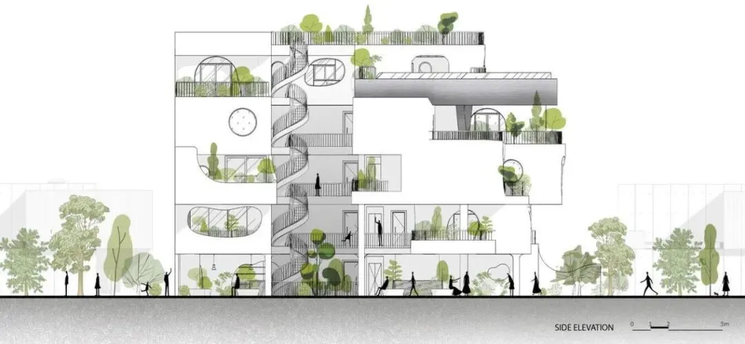 设计团队摒弃现代材料,建议使用花岗岩水磨石 —— 这是一种传统且环保的材料,能带来质朴而温馨的感觉。这种材料表面粗糙,不仅营造出丰富的质感层次,还如同一个精致的“外壳”,调节光线和通风,全天形成不断变化的阴影图案,使项目始终充满活力。