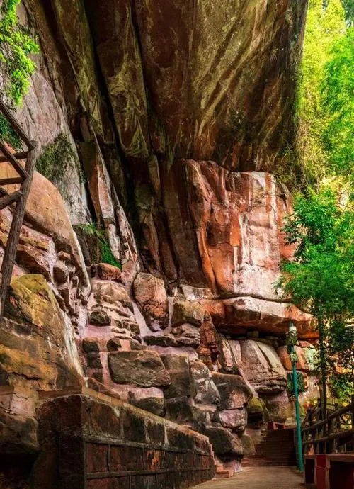 佛光岩这个地方,很多人第一眼看到会觉得是P的,因为那片岩壁实在太红了,红到你会怀疑这是不是后期调色调出来的,但你走近了就会明白,这个红不是表面涂的颜色,是岩石本身的质地,是几亿年地质运动形成的丹霞地貌,而且这种红还不是死的,它会随着光线的变化而变化,早上是暗红、中午是橙红、傍晚又变成金红,这种活的颜色才是佛光岩真正厉害的地方。