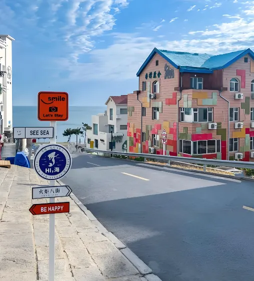 第六站:火炬八街因酷似《灌篮高手》镰仓场景而爆红。这条直通海岸的坡道,尽头就是蔚蓝大海,视觉冲击力极强。想拍出无人的大片,建议早上6点半之前去,或者傍晚蓝调时刻。两侧彩色的房子和路尽头的海平面构成了绝美的二次元世界。这里不需要门票,就在威海国际海水浴场附近,可以安排在同一天下午游览。