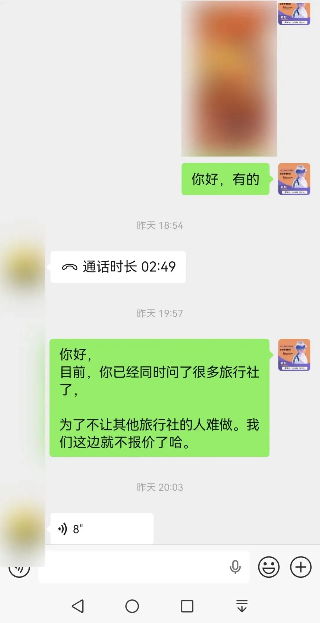 “你好,目前你已经同时问了很多旅行社了,为了不让其他旅行社的人难做,我们这边就不报价了哈。”