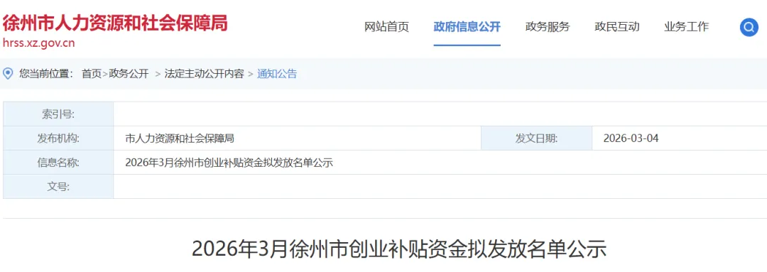 根据《关于转发<江苏省就业补助资金管理办法>的通知》(徐财社〔2025〕141号)等相关规定,经申请人申报、区创业指导机构初审、市创业工作指导中心复审,现对2026年3月徐州市创业补贴资金拟发放名单予以公示。