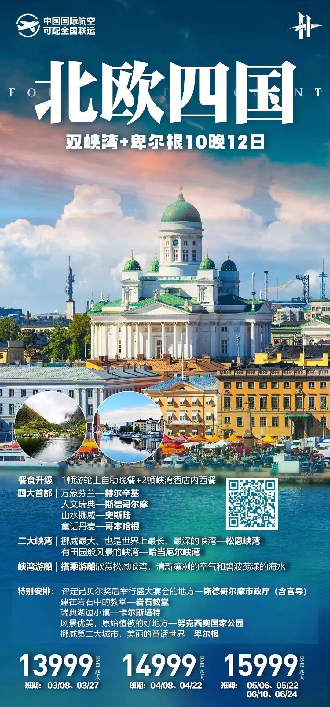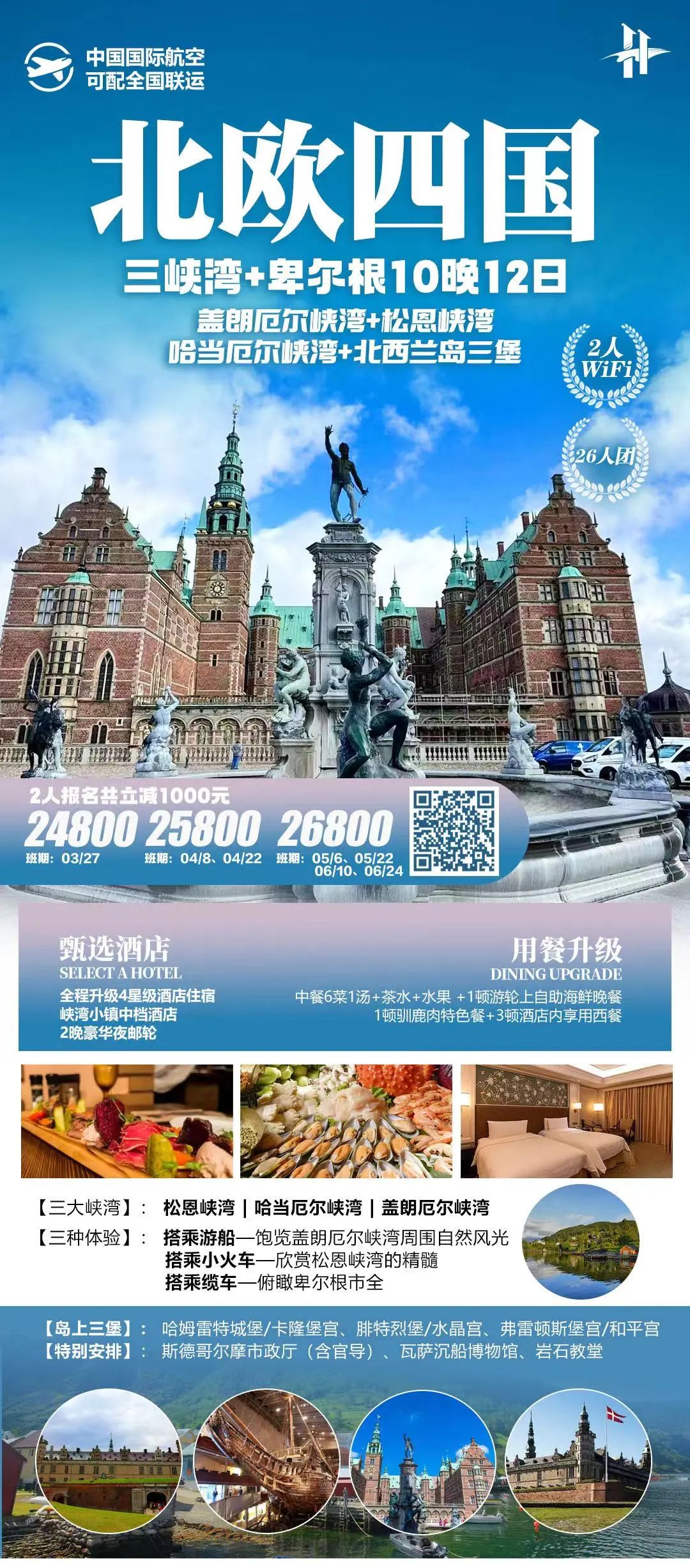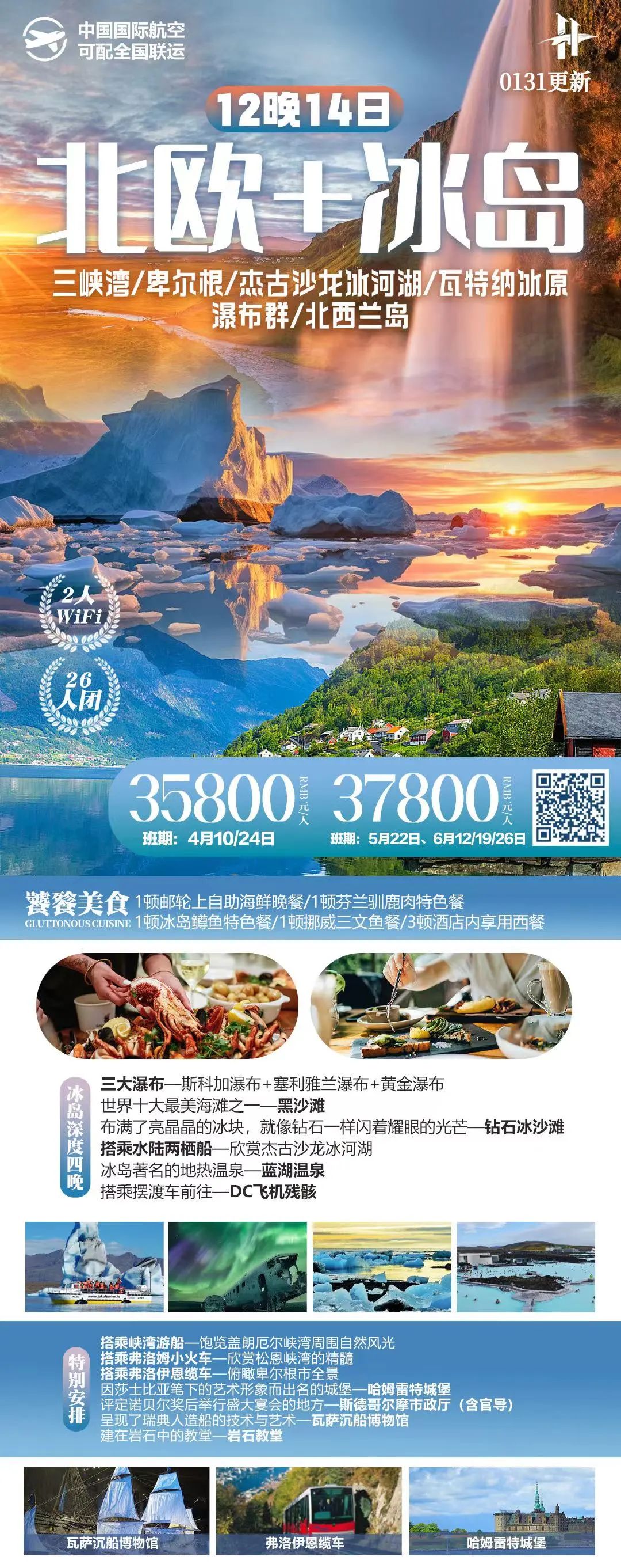 ?4月10/24日?35800元/人?5月22日、6月12/19/26日?37800元/人?中国国航♾️双点进出♾️华东地区联运免费?驯鹿肉+三文鱼+鳟鱼+海鲜自助+酒店西餐?26人精品团———————————————??冰岛深度斯科加瀑布+赛利雅兰瀑布+黄金瀑布黑沙滩+钻石冰沙滩?️D3飞机残骸瓦特纳冰源+杰古沙龙湖两栖船蓝湖温泉??芬兰??瑞典??丹麦??挪威⑴哈当厄尔峡湾⑵搭乘小火车欣赏松恩峡湾精髓⑶搭乘游船欣赏盖朗厄尔峡湾瀑布群⑷卡隆堡宫—又称哈姆雷特城堡⑸斯德哥尔摩市政厅?️,诺贝尔颁奖地⑹瓦萨沉船博物馆?⑺建在岩石中的岩石教堂⛪️⑻弗罗伊恩缆车俯瞰卑尔根全景?