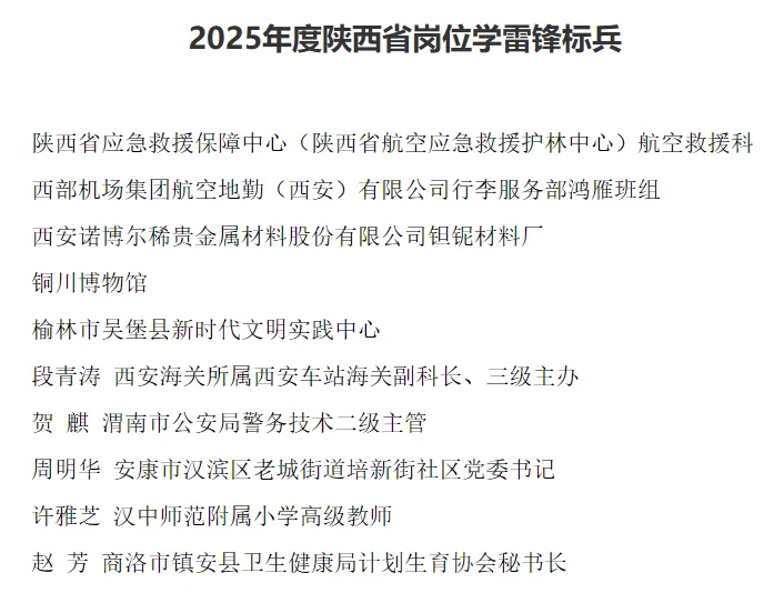 为深入学习贯彻习近平总书记关于弘扬雷锋精神的重要论述,更好发挥先进典型示范带动作用,让雷锋精神在三秦大地绽放更加璀璨的光芒,中共陕西省委宣传部决定,命名陕西省应急救援保障中心(陕西省航空应急救援护林中心)航空救援科等10个集体和个人为“2025年度陕西省岗位学雷锋标兵”。希望全省岗位学雷锋标兵珍惜荣誉、再接再厉,立足本职、建功岗位,始终做雷锋精神的忠实传承者和社会主义核心价值观的模范践行者。