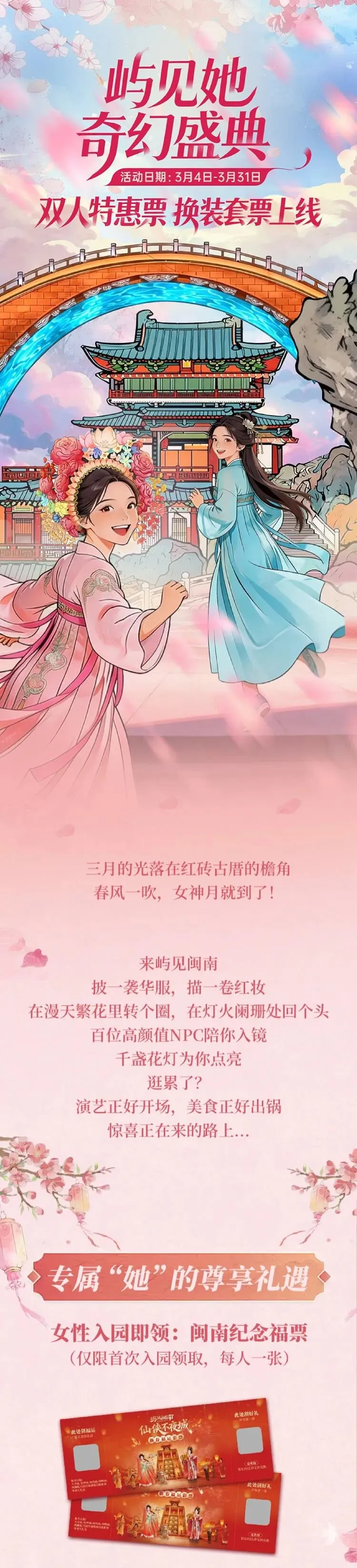 屿见“她”奇幻盛典来袭!【屿见闽南主题景区】¥148/1大1小(6-14周岁)、¥168双人特惠票!女性首次入园可领取闽南纪念福票1张