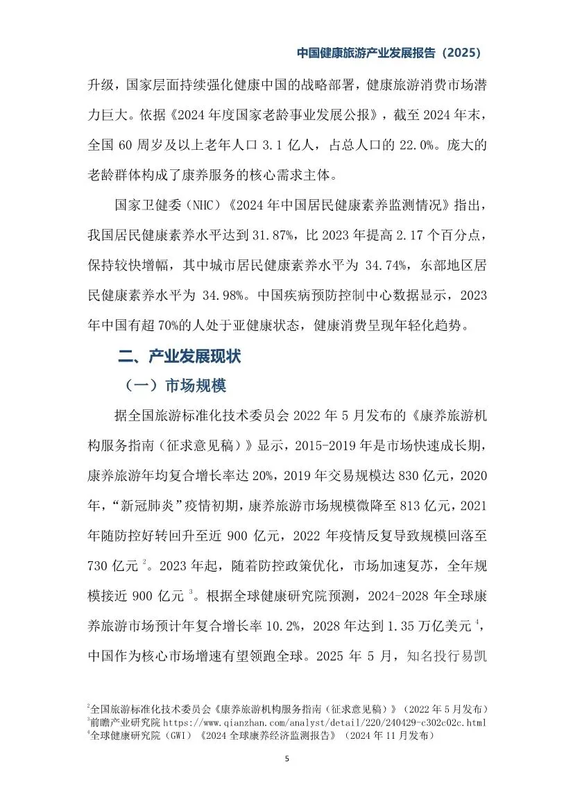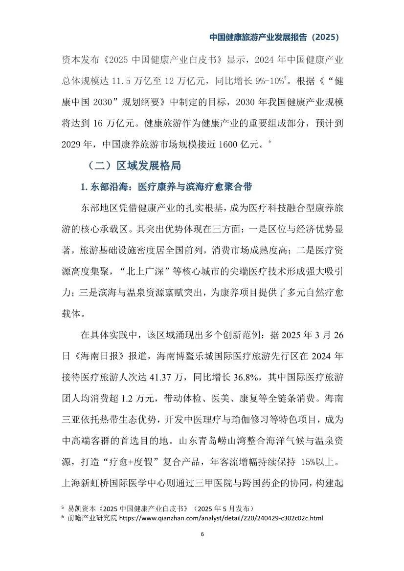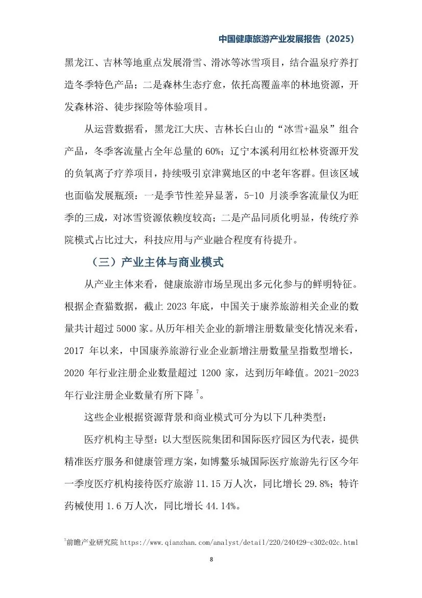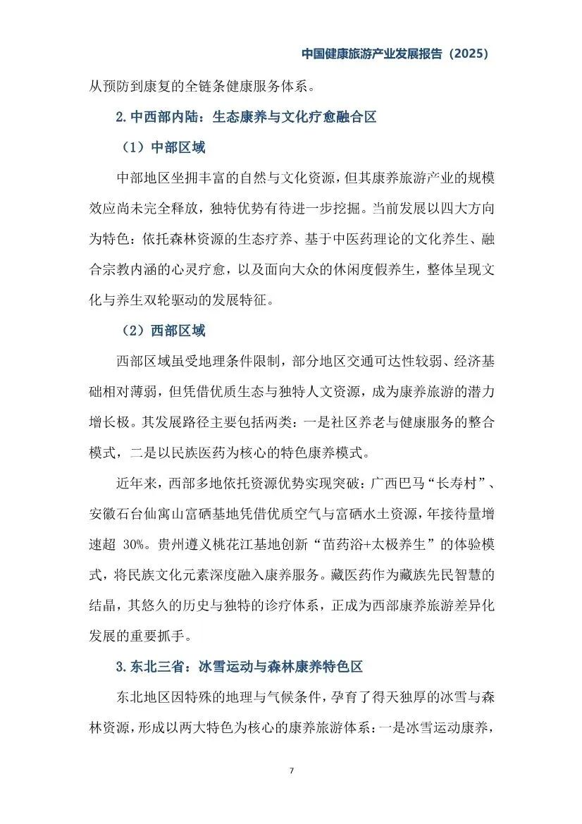 这份《中国健康旅游产业发展报告(2025)》由中国旅游协会健康旅游分会与山东泰山文化和旅游规划设计院联合编纂,系统性地梳理了中国健康旅游产业的概念、现状、政策、市场、案例及未来趋势。以下是对该报告的全面解读与分析: 一、 核心定义与产业框架:从“小众高端”走向“大众普惠” 报告开宗明义,将健康旅游定义为“以促进身心健康为核心,融合医疗、康养、生态、文化等多元业态的旅游形式”,其服务覆盖预防、治疗、康复全周期,目标客群已从病患扩展至亚健康及健康人群。 1. 概念细分:产业内部可分为两大主线: ◦ 康养旅游:侧重通过自然和环境方式促进健康,如运动、调理、理疗、温泉疗养等。 ◦ 医疗旅游:涉及专业的疾病诊断、治疗与康复,需医疗设施和人员支持。 2. 类型矩阵:报告构建了五大类型矩阵,清晰地展示了产业的多元化业态: ◦ 医疗健康服务型(如高端治疗、慢性病管理) ◦ 康养度假型(如温泉、森林康养) ◦ 文化养生驱动型(如中医药、民族医药养生) ◦ 生态疗愈依托型(如富硒、滨海疗愈) ◦ 运动康养融合型(如冰雪、山地运动) 核心洞察:产业本质是旅游与健康产业的跨界融合,其发展正从过去的“小众高端”服务,向满足更广泛人群健康需求的“大众普惠”市场转型。 二、 发展现状:市场快速复苏,区域格局特色鲜明 1. 市场规模与潜力: ◦ 全球视角:2023年全球健康旅游支出创8302亿美元新高。中国表现突出,健康旅游消费支出达557亿美元,位居全球第三、亚太第一;出行人次1.587亿,全球第二,消费潜力巨大。 ◦ 国内市场:经历疫情波动后快速复苏,2023年市场规模回升至近900亿元。预计到2029年,中国康养旅游市场规模将接近1600亿元。作为健康产业(2024年规模约11.5-12万亿元)的重要组成部分,增长空间广阔。 2. 区域发展“三足鼎立”格局: ◦ 东部沿海(医疗康养与滨海疗愈聚合带):依托尖端医疗资源、成熟消费市场及滨海/温泉资源,发展医疗科技融合型康养。典型如海南博鳌乐城(2024年接待医疗旅游41.37万人次)、上海新虹桥医学中心。 ◦ 中西部内陆(生态康养与文化疗愈融合区):凭借优质生态与独特文化(中医药、民族医药),发展生态疗养与文化养生。如广西巴马、安徽石台仙寓山等“长寿”“富硒”目的地年客流量增速超30%。 ◦ 东北三省(冰雪运动与森林康养特色区):利用独特气候资源,打造“冰雪+温泉”、“森林生态疗愈”特色产品。但面临季节性显著、产品同质化挑战。 3. 产业主体多元化:市场主体超过5000家,主要包括医疗机构主导型、旅游企业延伸型、地产企业转型型(如泰康之家)及科技公司赋能型,呈现多元化竞争与融合态势。 三、 政策环境:顶层设计完善,地方创新频出 报告指出,产业的蓬勃发展得益于持续完善且强有力的政策支持体系。 1. 国家战略框架完善:自2016年《“健康中国2030”规划纲要》奠基以来,国家层面密集出台了超过15项重要政策(报告列表详述),从“十四五”旅游业规划、中医药发展规划,到2025年最新的《促进健康消费专项行动方案》,形成了覆盖产业融合、消费促进、细分市场培育的全方位政策网络。 2. 地方政策创新活跃:各省市因地制宜推出特色政策。例如,吉林打造“康养吉林”中医药旅游品牌,山东培育特色康养旅游路线,海南实施三年行动方案打响“健康岛”品牌,广东、安徽、云南等地也纷纷将康养与银发经济、乡村振兴深度融合。 四、 市场需求与细分赛道:全龄化、多元化特征凸显 1. 四大核心消费群体: ◦ 银发康养族(60岁以上):候鸟式旅居,重医疗配套,停留时间长。 ◦ 中年保健族(35-60岁):亚健康调理主力,重专业性与预防,愿为品质付费。 ◦ 青年养生族(18-35岁):健康消费支出占比高(83.7%),偏好短期、高频、有趣的养心养生产品。 ◦ 国际医疗客:入境客青睐博鳌等地特许医疗,出境客倾向日韩重症治疗与医美。 2. 五大细分市场深度剖析: ◦ 中医药康养旅游(市场份额19%,领先):通过中医诊疗、药膳、养生功法等体验实现文化赋能。如河南鄢陵唐韵小镇年接待50万人次。 ◦ 医疗健康旅游(份额10%,高端化):分为重症治疗型(博鳌乐城)、健康管理型(九华山庄体检)、医美抗衰型,客单价高,是产业升级关键。 ◦ 温泉康养旅游:趋势是康养科学化、体验多元化、技术融合化,从单一泡浴向综合康疗升级。 ◦ 森林康养旅游:发展模式包括森林疗愈基地、生态康养社区、自然教育体验。 ◦ 文化康养旅游:从儒、道、佛家文化中汲取智慧,提供心灵疗愈类精神产品。 五、 典型案例:四种成功模式解析 报告深度分析了四种差异化的发展范式: 1. 海南博鳌乐城:政策驱动的“医疗特区”模式 ◦ 核心:依托“特许医疗”政策,引进超470种国际前沿药械,打造高端医疗产业集群。 ◦ 融合:构建“医疗+会展+旅游+免税”全产业链生态,吸引境外消费回流。 2. 以岭健康城:理论引领的“医药健养”一体化模式 ◦ 核心:以吴以岭院士“络病学”理论为基础,贯通药材种植、研发、医疗、养生、旅游全链条。 ◦ 特色:提供从健康管理到特色住宿、药膳食疗的一站式服务,是中医药文旅融合标杆。 3. 北京九华山庄:资源整合的“文旅康养综合体”模式 ◦ 核心:以历史皇家温泉资源为基础,成功融合温泉度假、大型会展、医疗医院、养老社区四大业态。 ◦ 启示:打造一站式全龄服务目的地,突破单